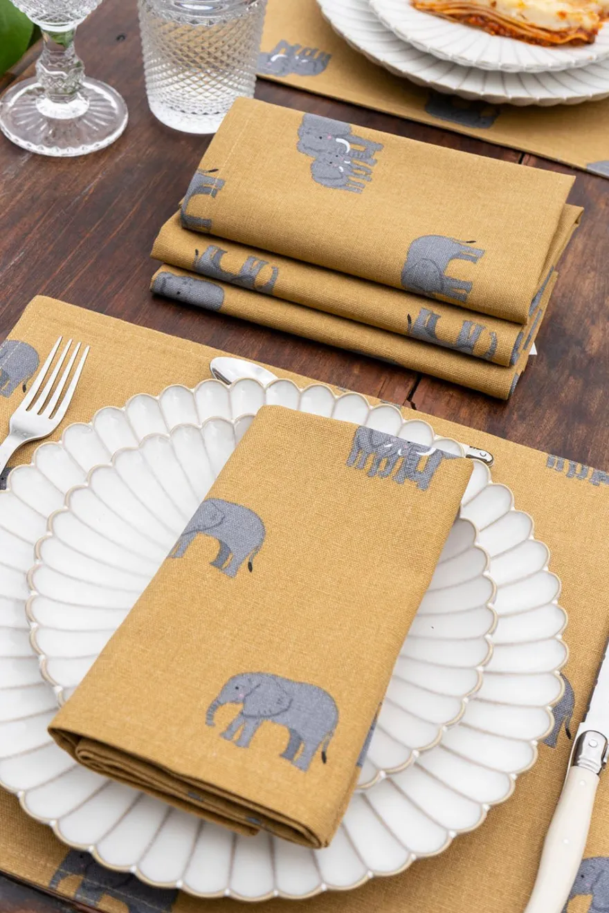 Set de cuatro servilletas 100% algodón con diseño de elefantes.