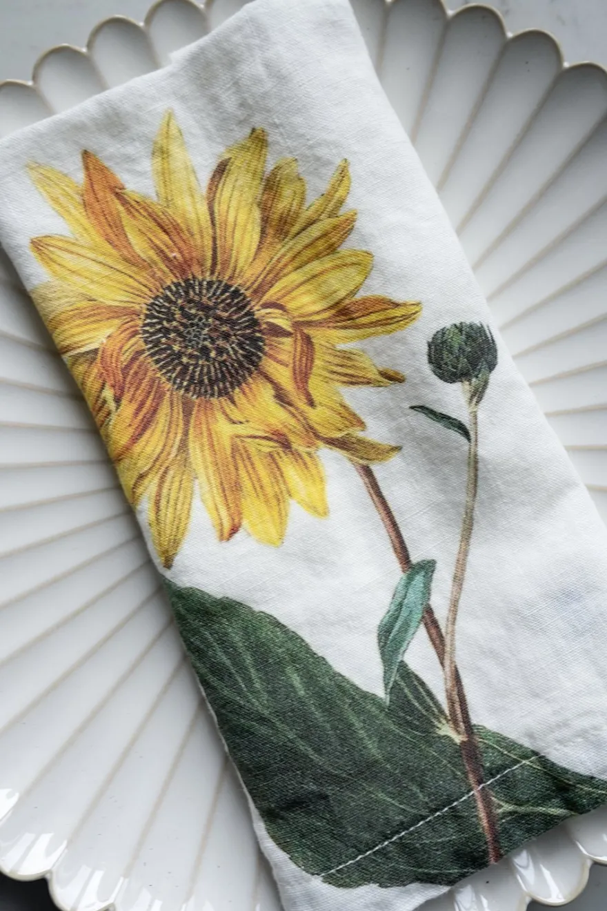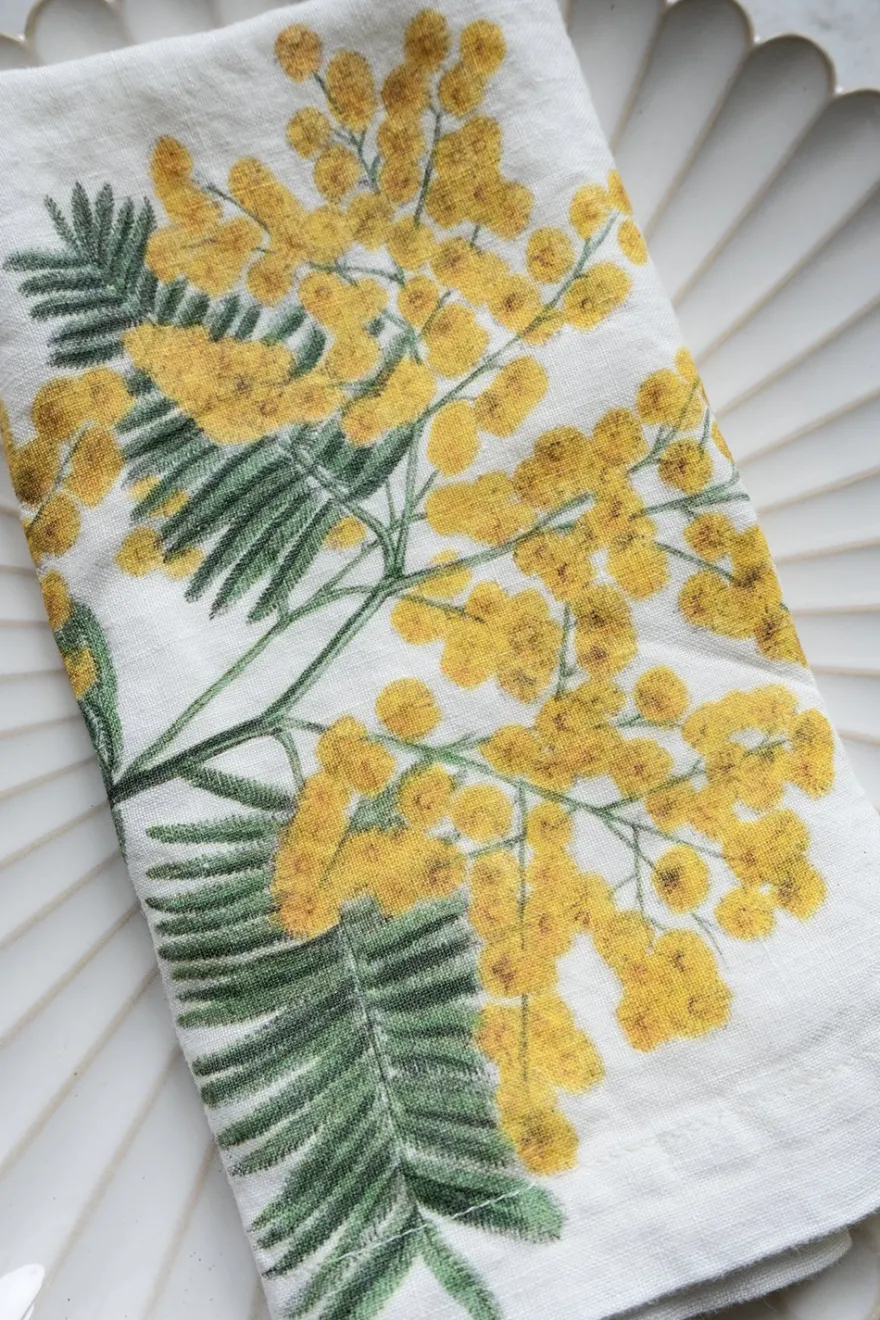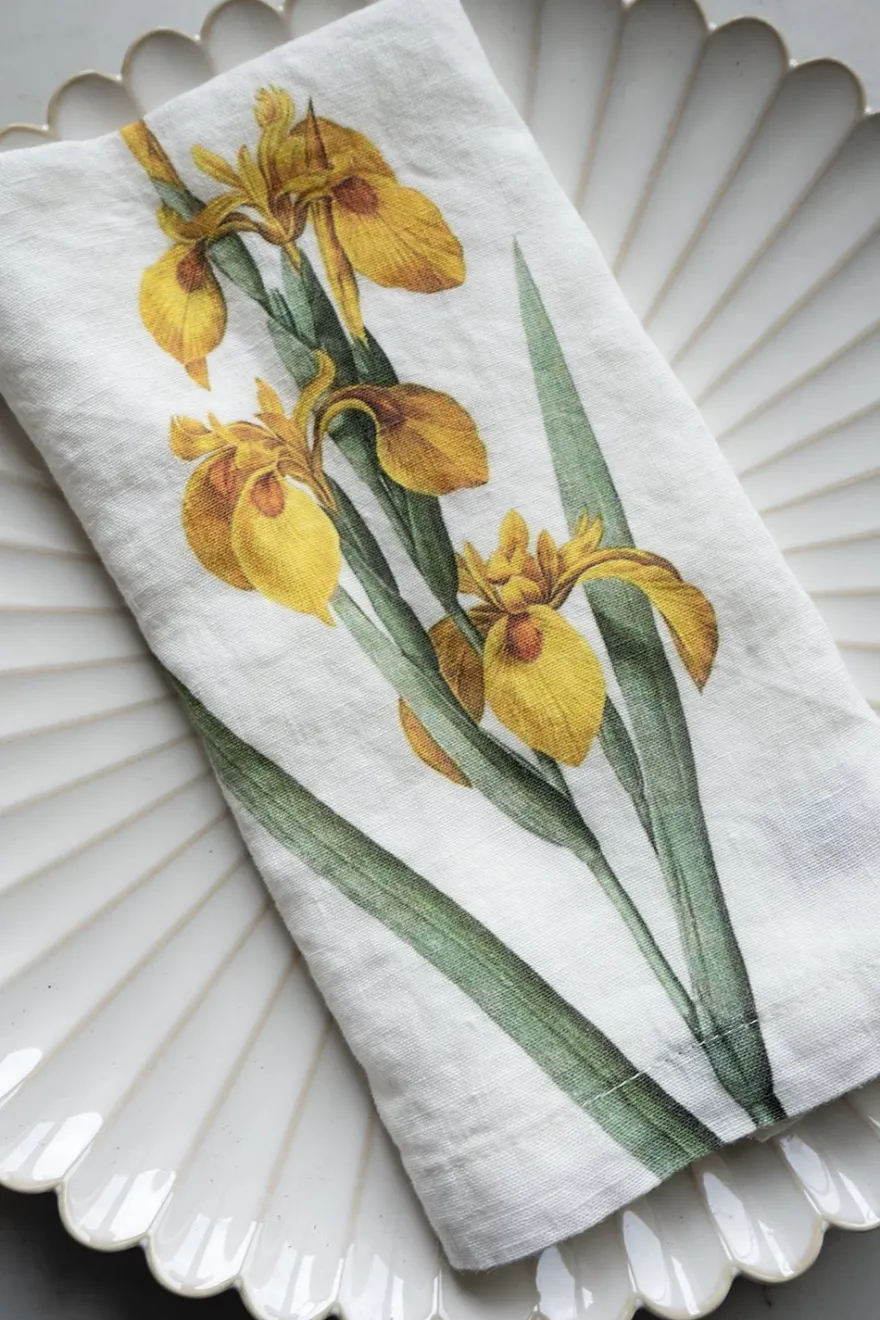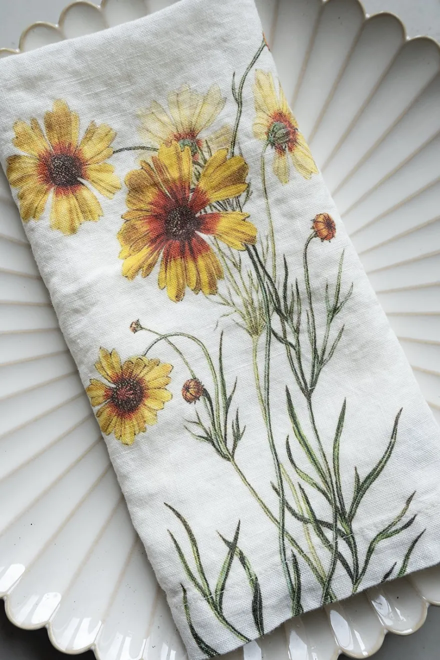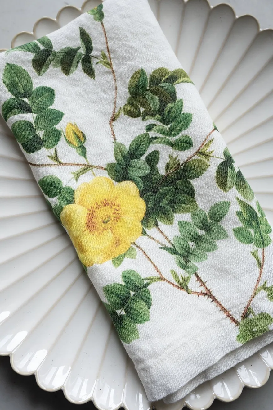 Seis servilletas de lino con distintas ilustraciones de flores de diferentes tonalidades amarillas sobre fondo blanco, elegantes, atemporales y muy duraderas, ya que están fabricadas con fibras textiles de primera calidad.