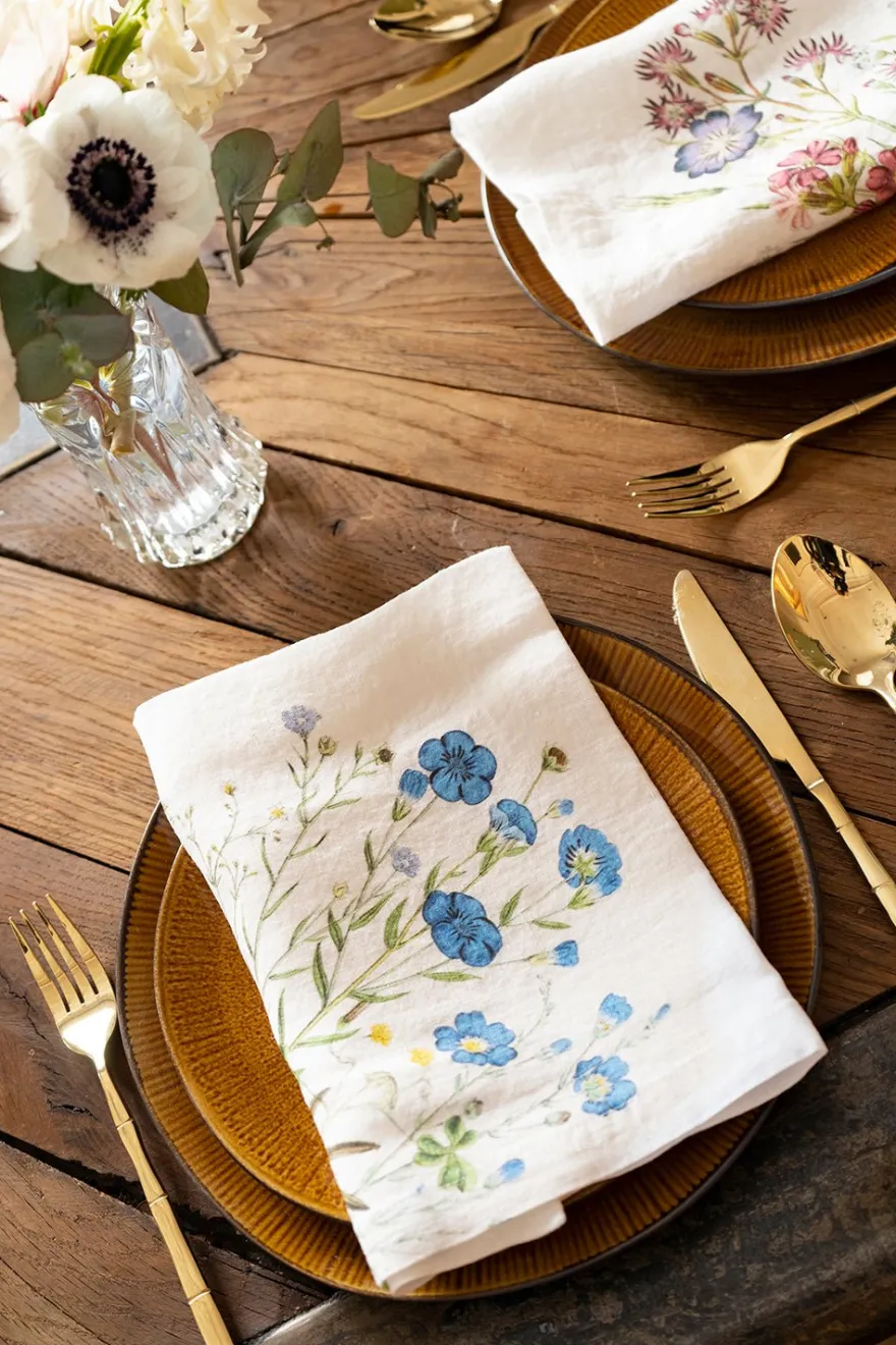 Seis servilletas de lino con distintas ilustraciones de flores silvestres de diferentes coloridos sobre fondo blanco, elegantes, atemporales y muy duraderas, ya que están fabricadas con fibras textiles de primera calidad.