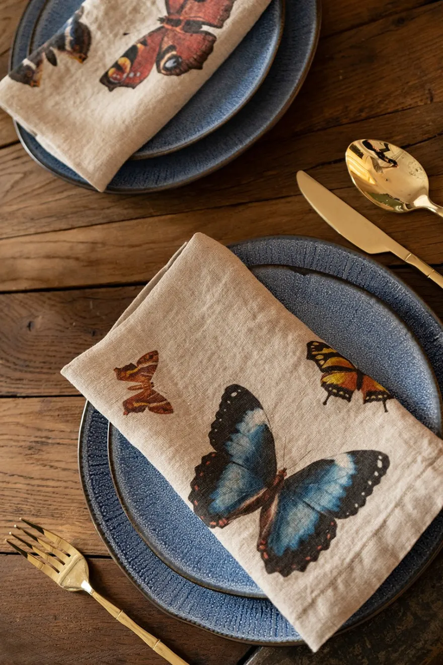 Seis servilletas de lino con distintas ilustraciones de mariposas de diferentes coloridos sobre fondo beige, elegantes, atemporales y muy duraderas, ya que están fabricadas con fibras textiles de primera calidad.