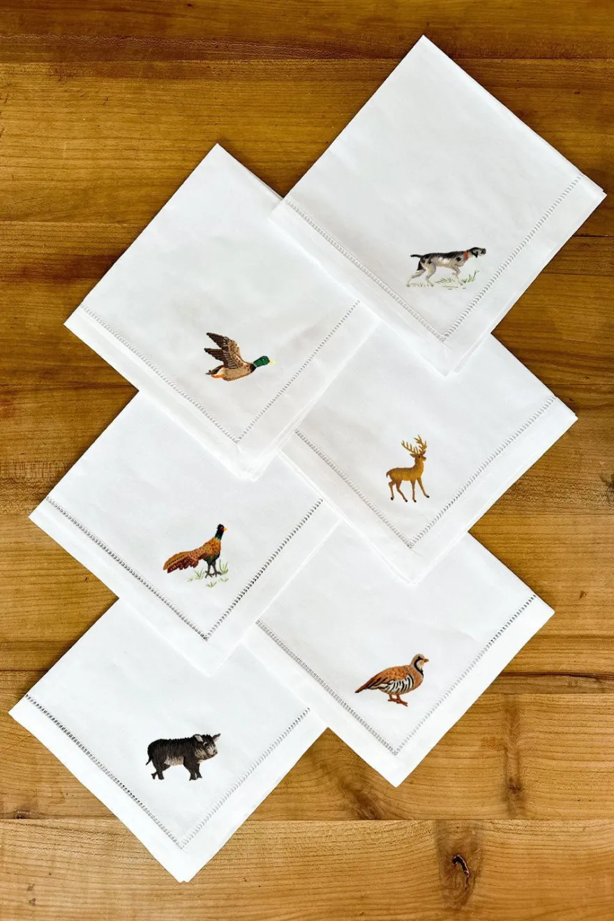 Este set de seis servilletas de 100% algodón bordadas a mano es perfecto para añadir un toque de elegancia natural a tu mesa. Cada servilleta presenta una delicada ilustración de un animal de caza diferente, cuidadosamente bordado a mano con hilos de distintos colores.