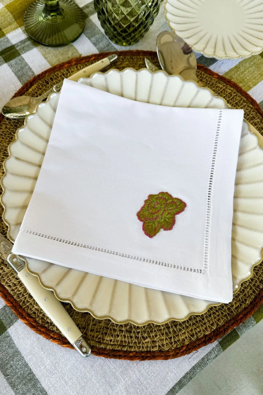 Este set de seis servilletas de 100% algodón bordadas a mano es perfecto para añadir un toque de elegancia natural a tu mesa. Cada servilleta presenta una delicada ilustración de una verdura diferente, cuidadosamente bordada a mano con hilos de distintos colores.
