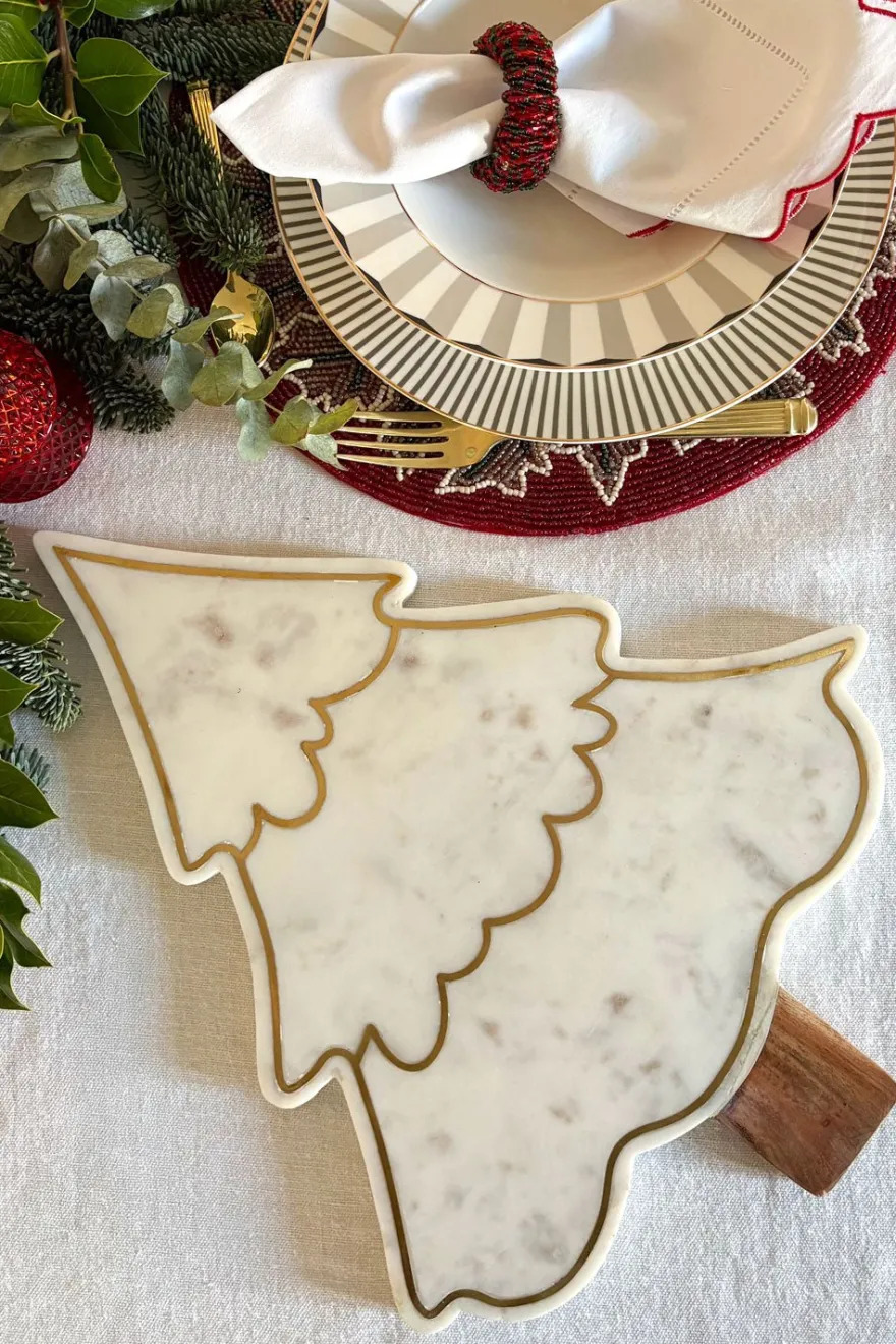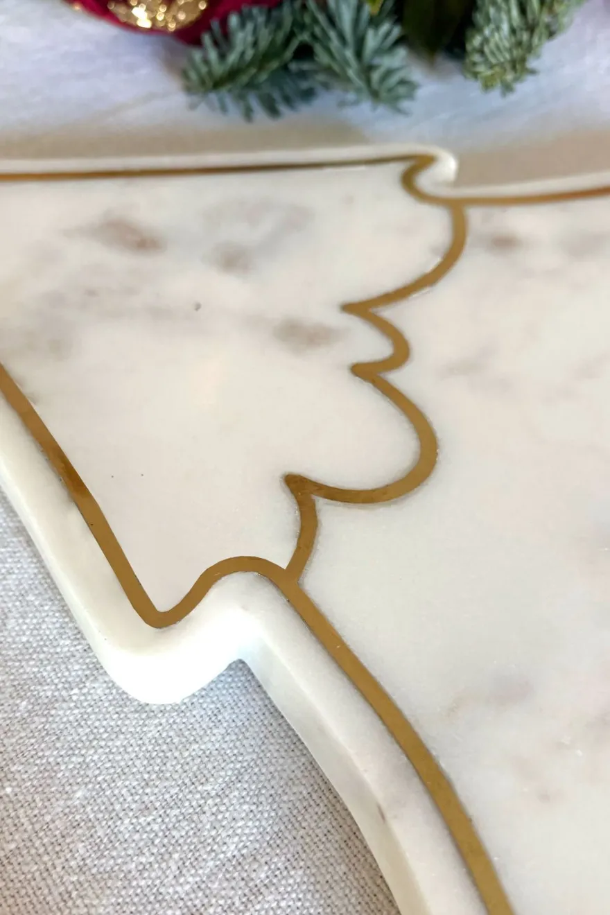 Esta tabla de mármol blanco presenta un delicado diseño de árbol de Navidad, ideal para aportar un toque festivo y elegante a cualquier mesa. Su borde íntegramente acabado en latón dorado realza el brillo y la sofisticación de la pieza, mientras que el mango de madera añade calidez y equilibrio al conjunto. Perfecta para servir, decorar o regalar durante la temporada navideña.