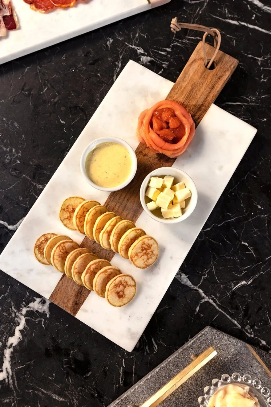 Tabla rectangular de mármol con mango de madera, ideal para servir quesos y embutidos.