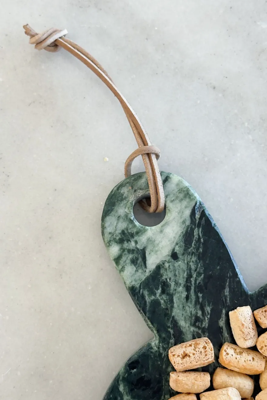 Tabla de servir que combina la elegancia del mármol verde con la calidez de la madera natural, creando una pieza única y sofisticada. Su diseño incluye un práctico mango que facilita su manejo.