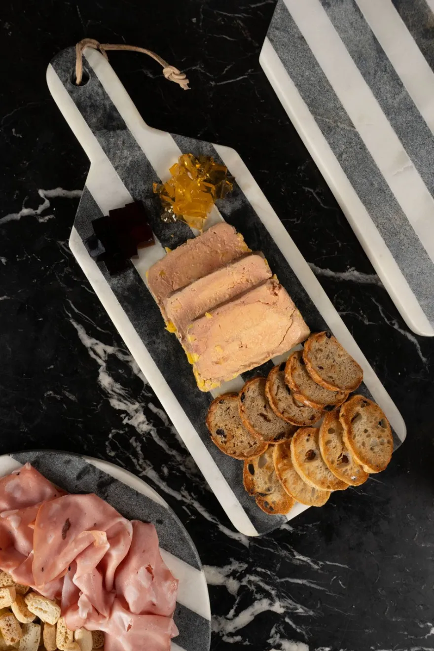 Tabla rectangular de mármol con diseño de rayas blancas y grises oscuras, ideal para complementar tus mesas en cualquier época del año.