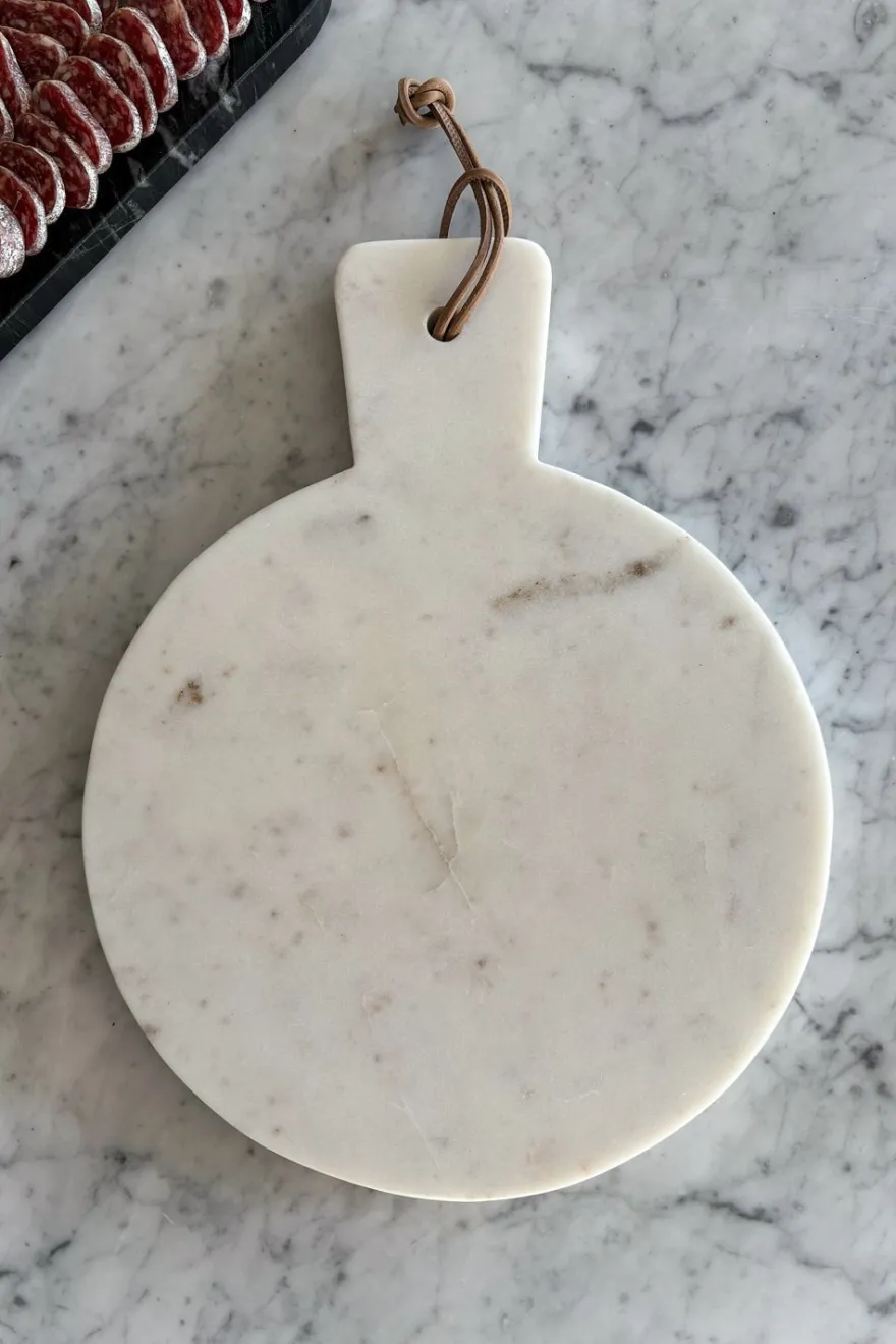 Tabla de mármol redonda de color blanca, ideal para complementar tus mesas en cualquier época del año. Esta tabla combina elegancia, sofisticación y durabilidad.
