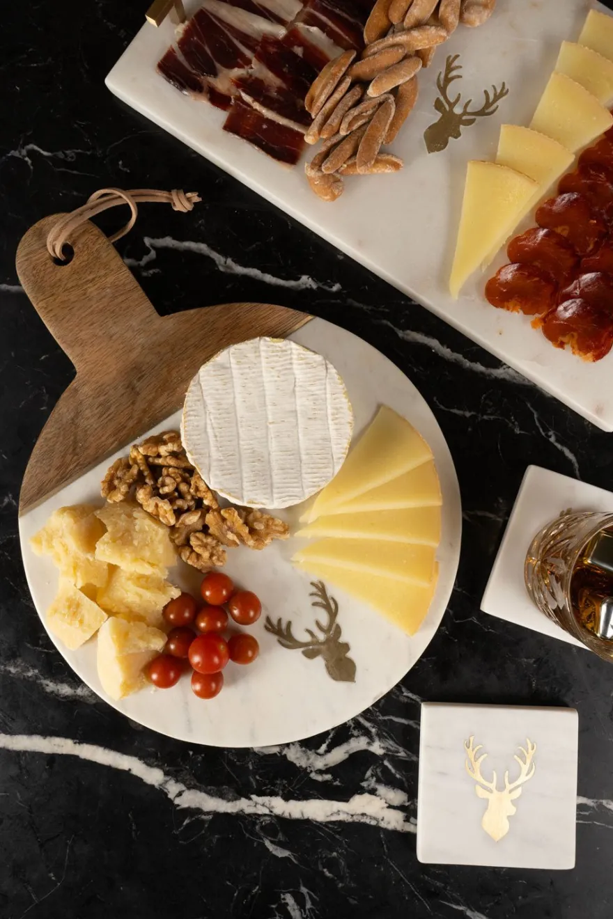 Tabla redonda de mármol y madera con ciervo de latón en color dorado, ideal para complementar tus mesas en Navidades o en cualquier época del año. También es perfecta para las casas de campo.