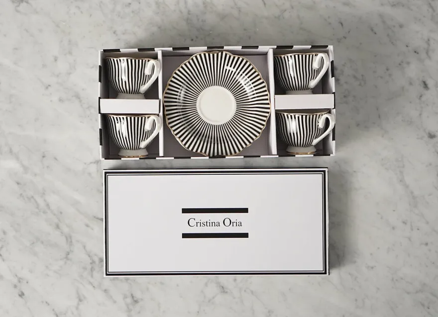 Juego para cuatro personas de taza y plato para el café de New Bone China, reconocida por ser muy fina, ligera y resistente.