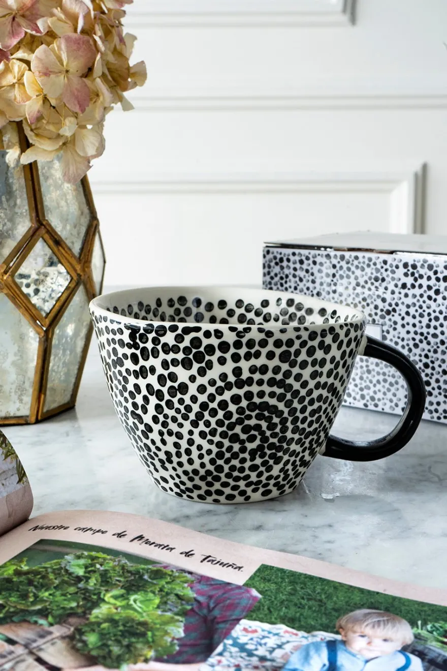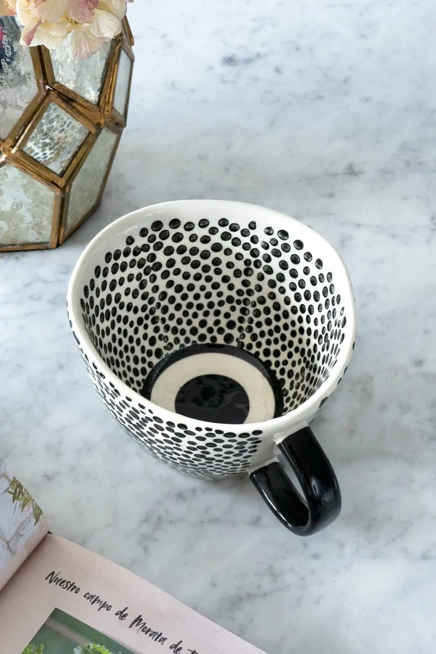 Mug de New Bone China en color blanca con puntos en color negro, su diseño es ligeramente irregular con estilo artesanal.