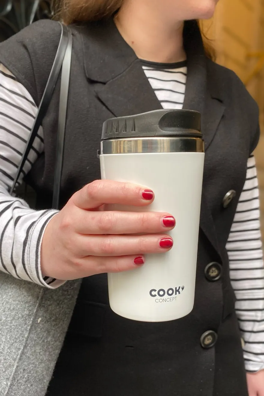 Vaso térmico de doble pared, perfecto para mantener las bebidas frías y calientes. Es de acero y tiene una tapa hermética.