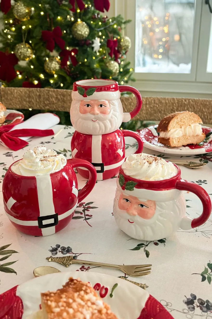 Set de dos tazas de nuestra vajilla de dolomita con alegres diseños de Papá Noel. Una taza representa la cabeza de Papá Noel y la otra su cuerpo; al apilarlas, forman la figura completa.