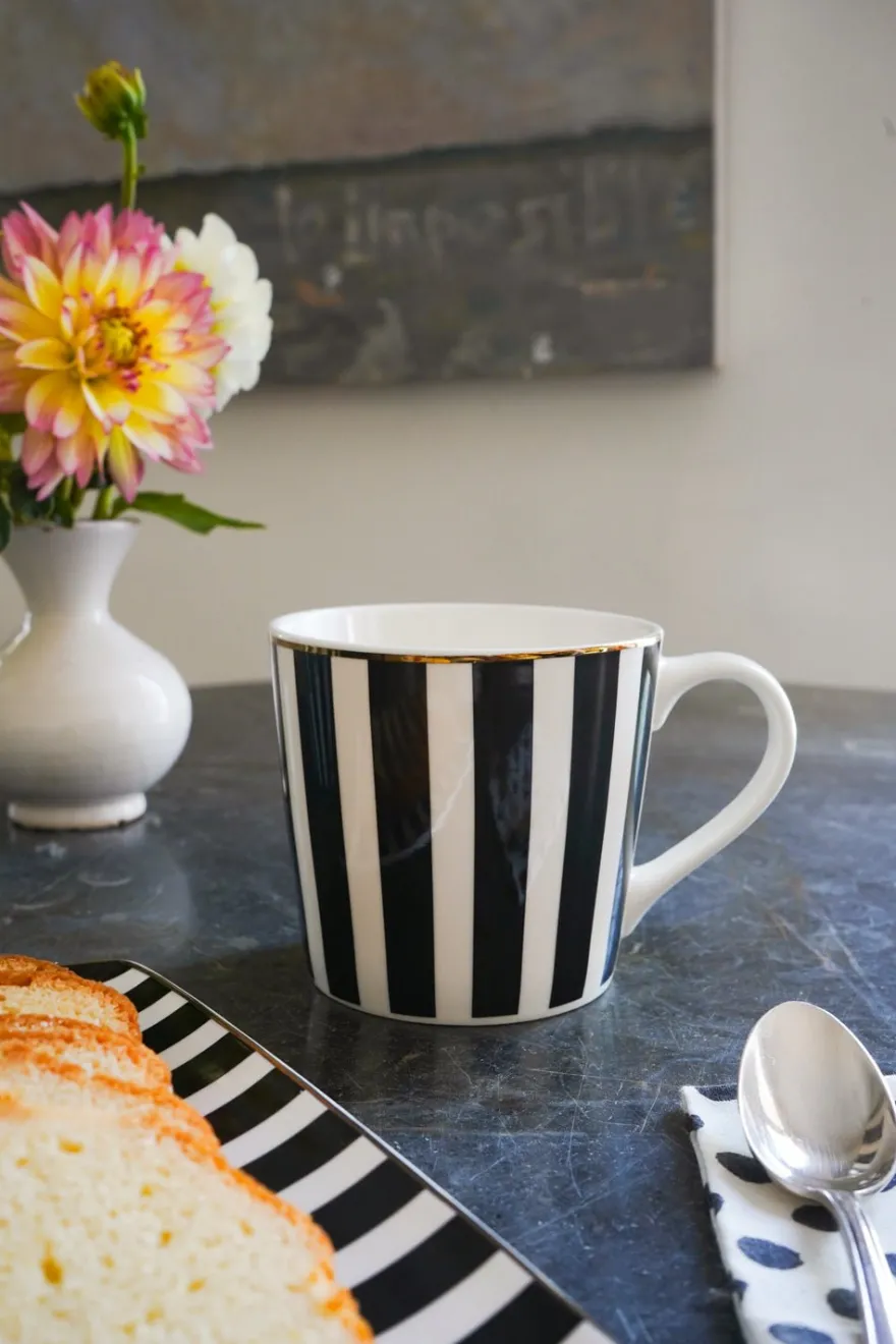 Taza negra y blanca con diseño de rayas y delicado filo dorado decorando, perfecta para disfrutar del café, té e infusiones, añadiendo un toque de elegancia a cualquier momento del día.