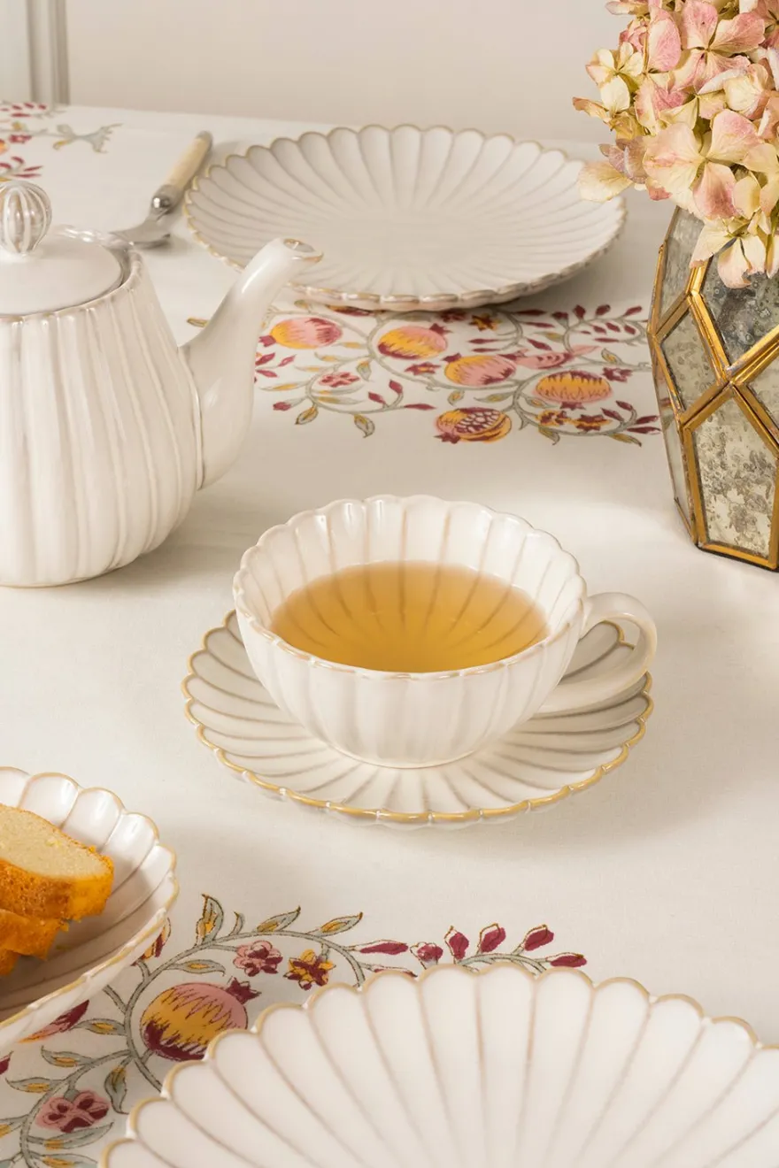 Taza y plato de nuestra Vajilla Blanca Flor CO de Stoneware, muy resistente y gracias a su diseño único con ondas en color blanco y remates en tonos crudos, es versátil para disfrutarla en cualquier época del año.