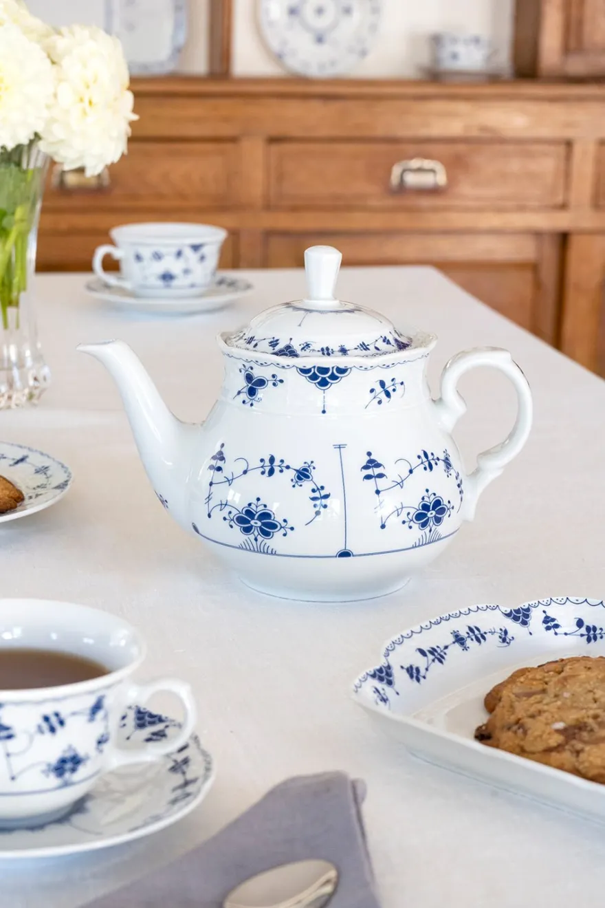 Tetera de nuestra vajilla de crisantemos azules CO, con diseño inspirado en la clásica vajilla de Royal Copenhagen para la familia real.