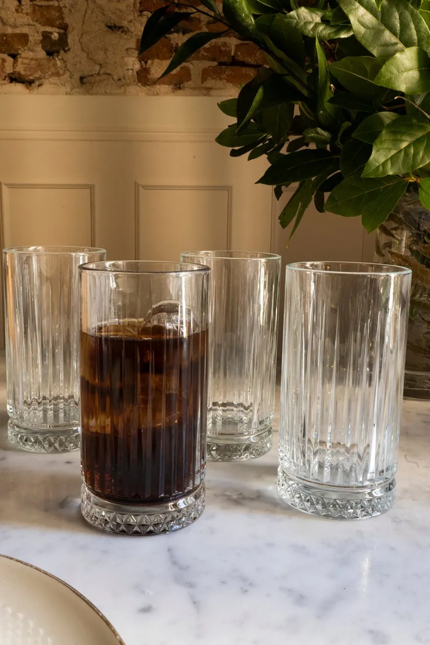 Set de cuatro vasos de cristal altos con diseño de rombos tallados en su base, duros y resistentes.