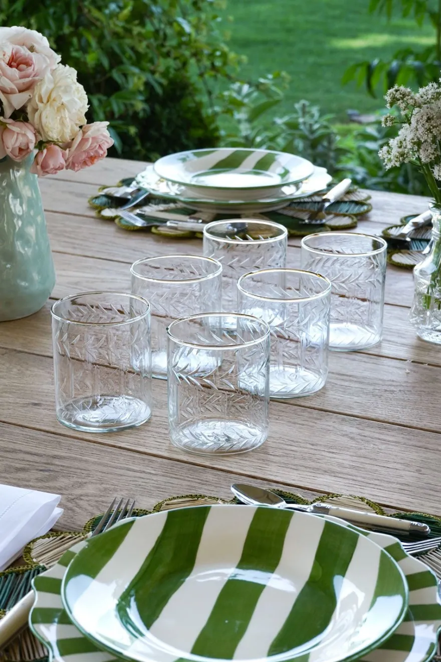 Set de seis vasos de nuestra cristalería de cristal soplado y tallada a mano que destaca por su elegancia atemporal y su meticuloso trabajo artesanal. Las irregularidades del diseño hacen única cada pieza.