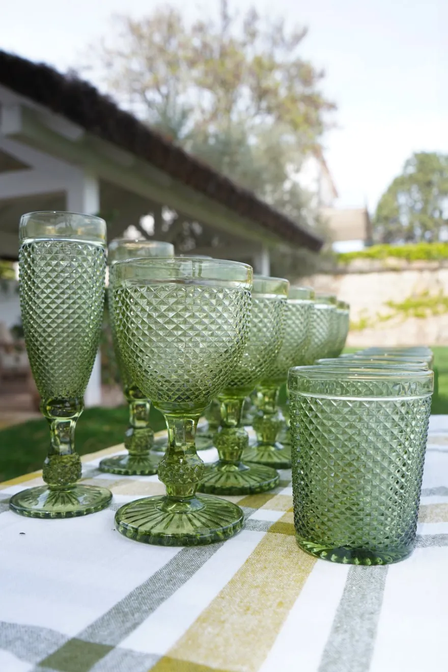 Set de seis vasos de cristal tallados con picos teñidos en color verde, ideal para cualquier ocasión.