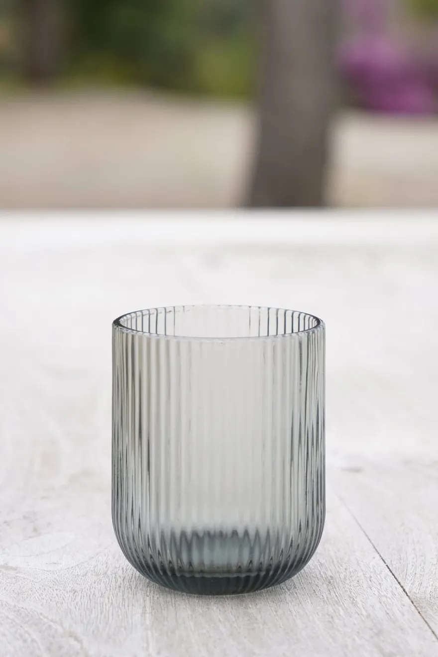 Set de seis vasos de cristal de diseño en color grises, ideales y versátiles para complementar todo tipo de mesas en cualquier época del año.
