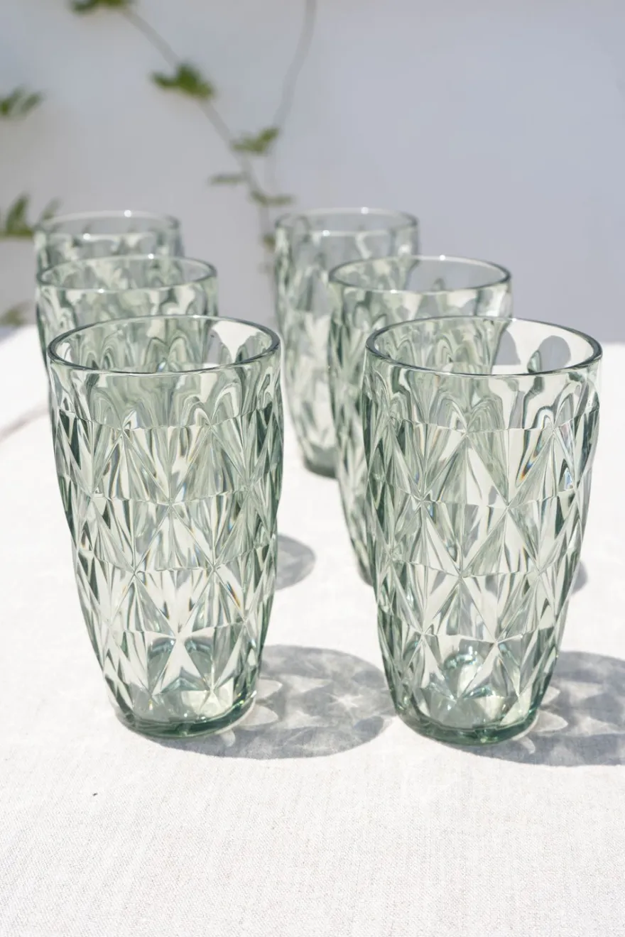 Set de seis vasos grandes verdes acrílicos con diseño de rombos, ideales para complementar y dar un toque fresco, original y diferente a tus mesas este verano.