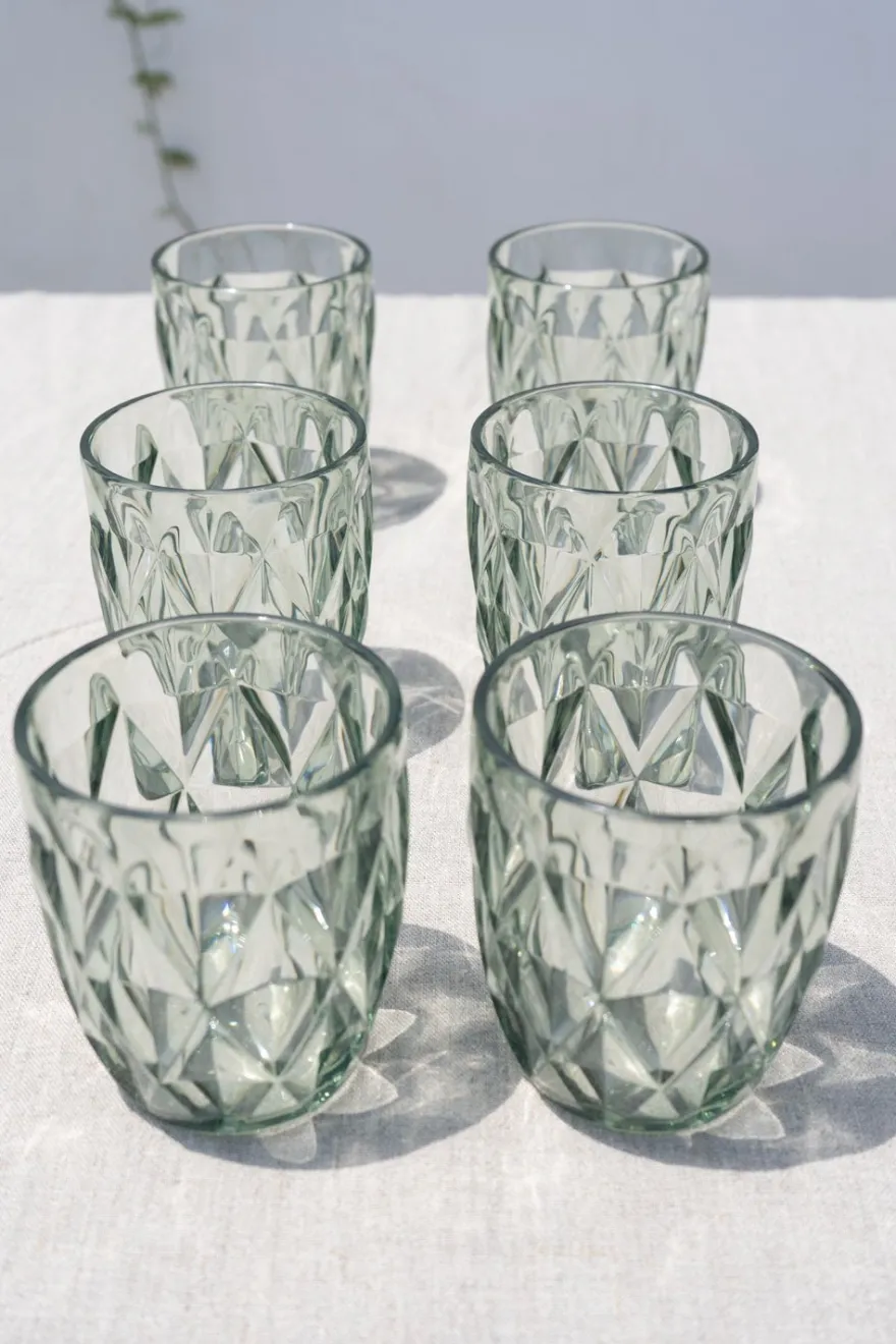 Set de seis vasos verdes acrílicos con diseño de rombos, ideales para complementar y dar un toque fresco, original y diferente a tus mesas este verano.