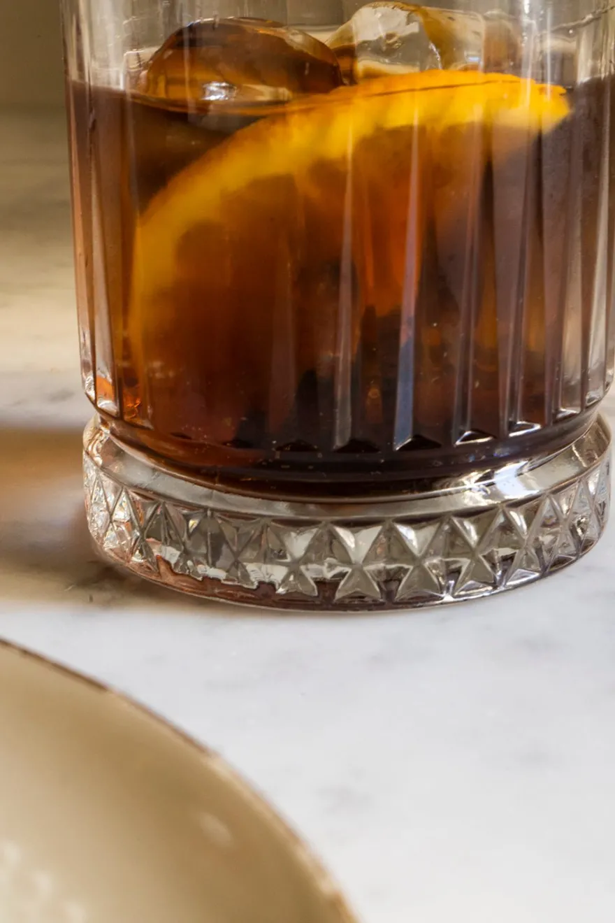 Vaso de cristal bajo con diseño de rombos tallados en su base, duros y resistentes.