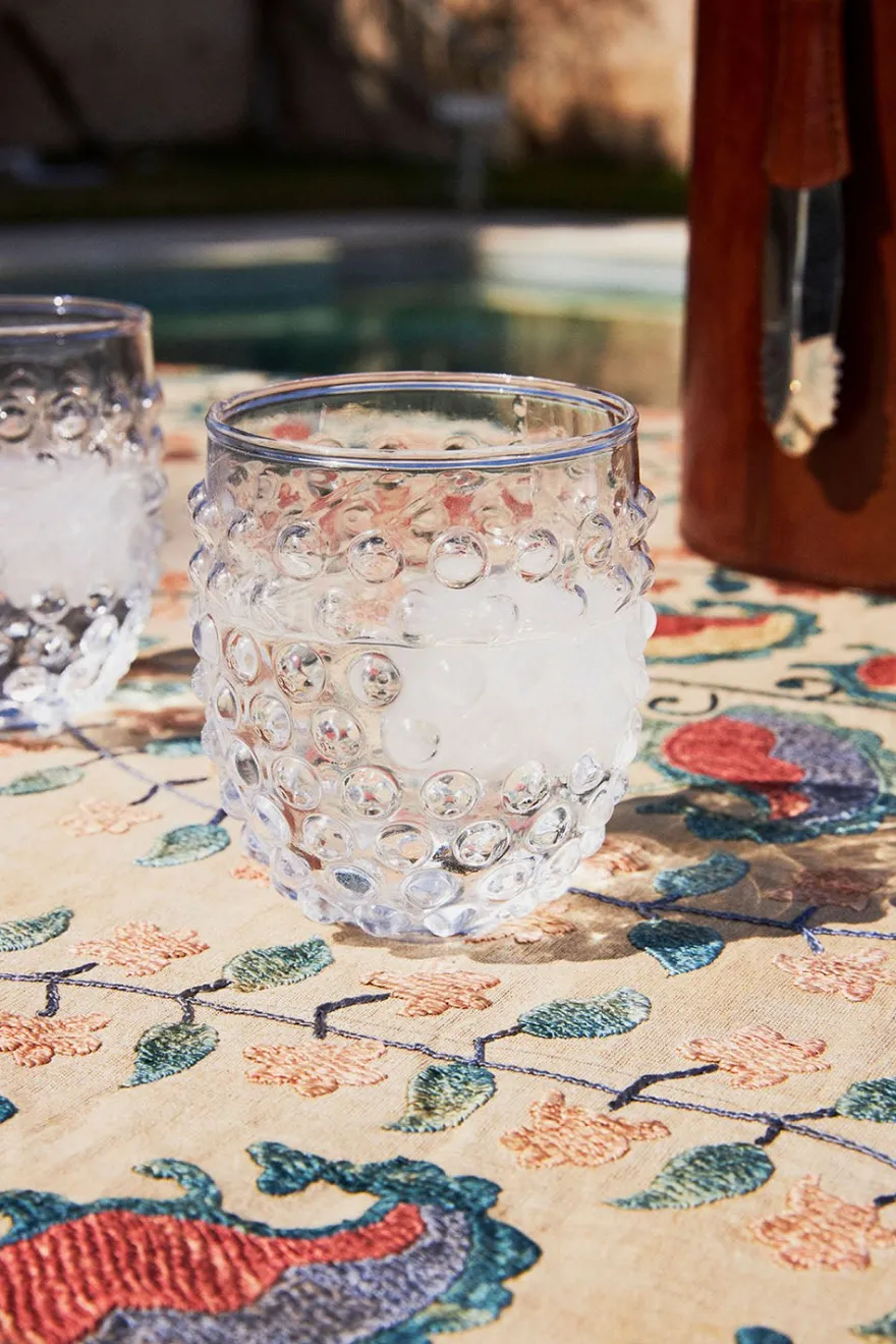 Vaso de cristal transparente con diseño de bolitas en relieve, original y versátil para cualquier mesa y época del año.