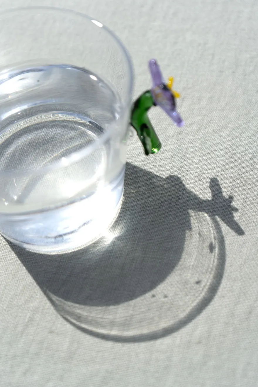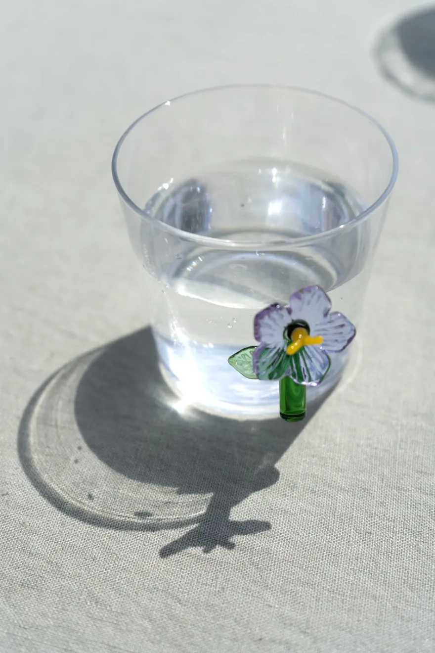 Vaso de vidrio borosilicato con diseño botánico con figura de flor lila en su lateral. Cada elemento de esta colección está hecho a mano en vidrio soplado, haciendo de cada producto una pieza única.