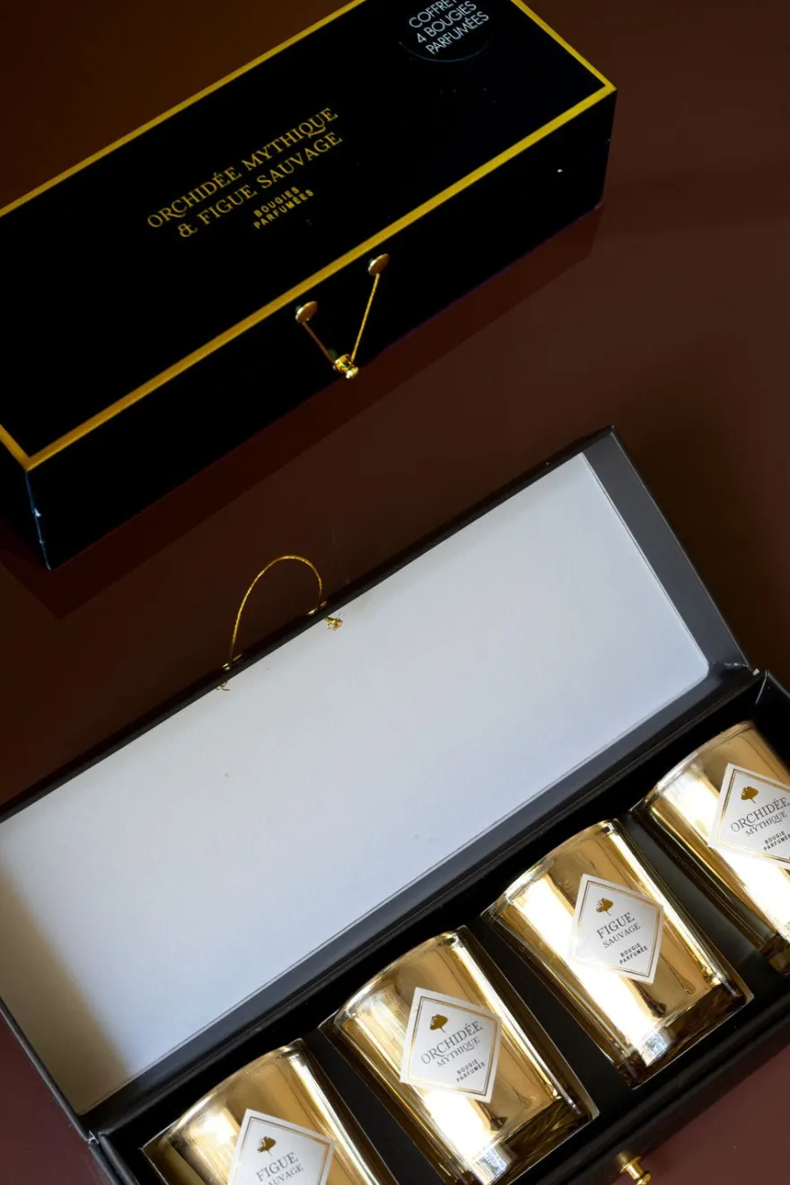 Elegante caja con cuatro velas perfumadas, dos de ellas con aroma a orquídea y las otras dos a higo, en vaso de vidrio de color dorado.