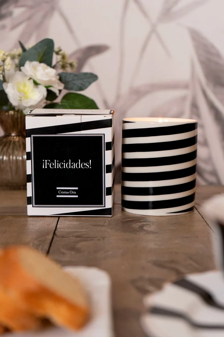 Vela aromática elaborada con ceras vegetales y con diseño de rayas blancas y negras, de la Vajilla Especial Cristina Oria.