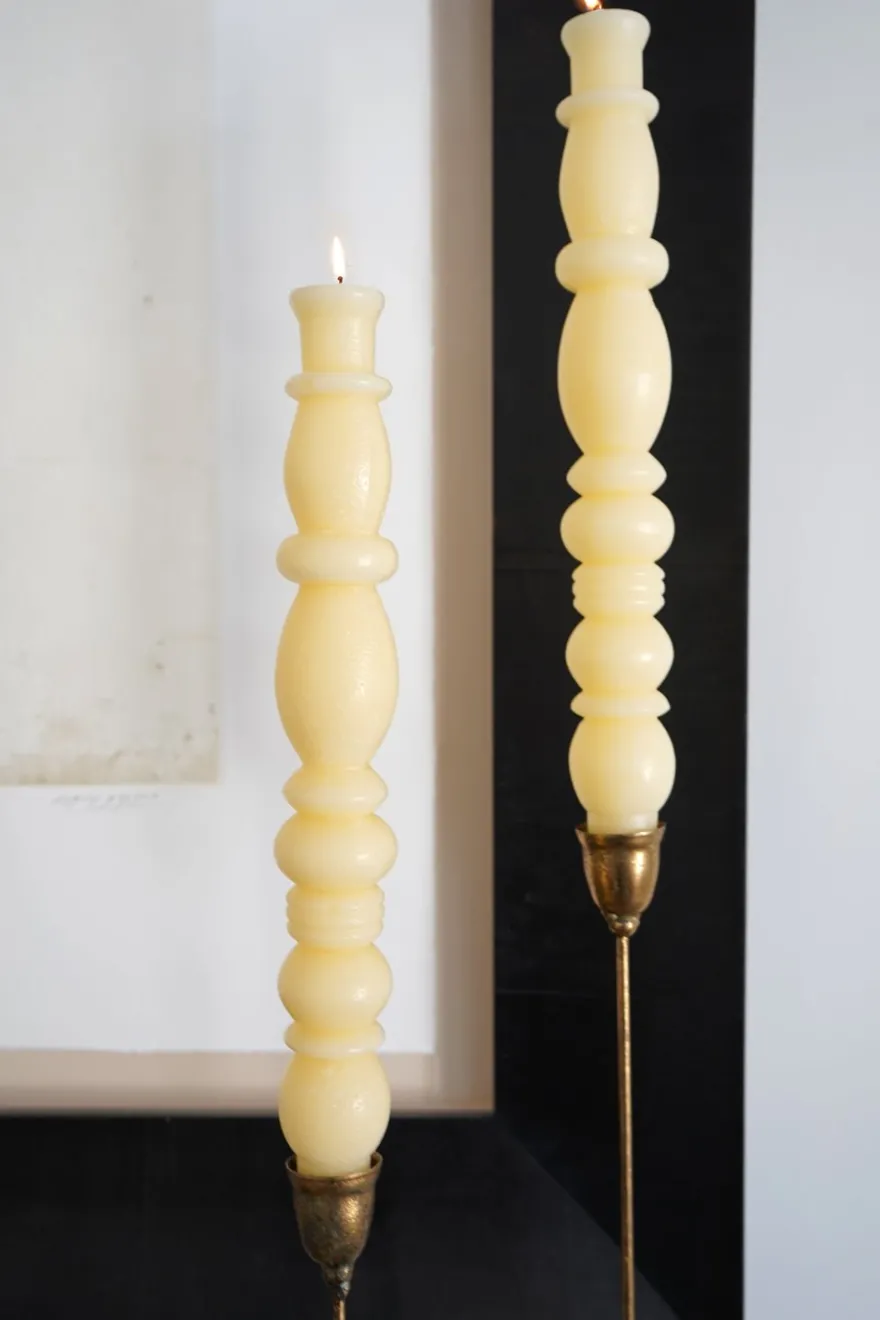 Set de dos velas con diseño de candelabro en color crema, ideales para crear una atmósfera romántica o añadir un toque de elegancia a cualquier rincón de tu casa.