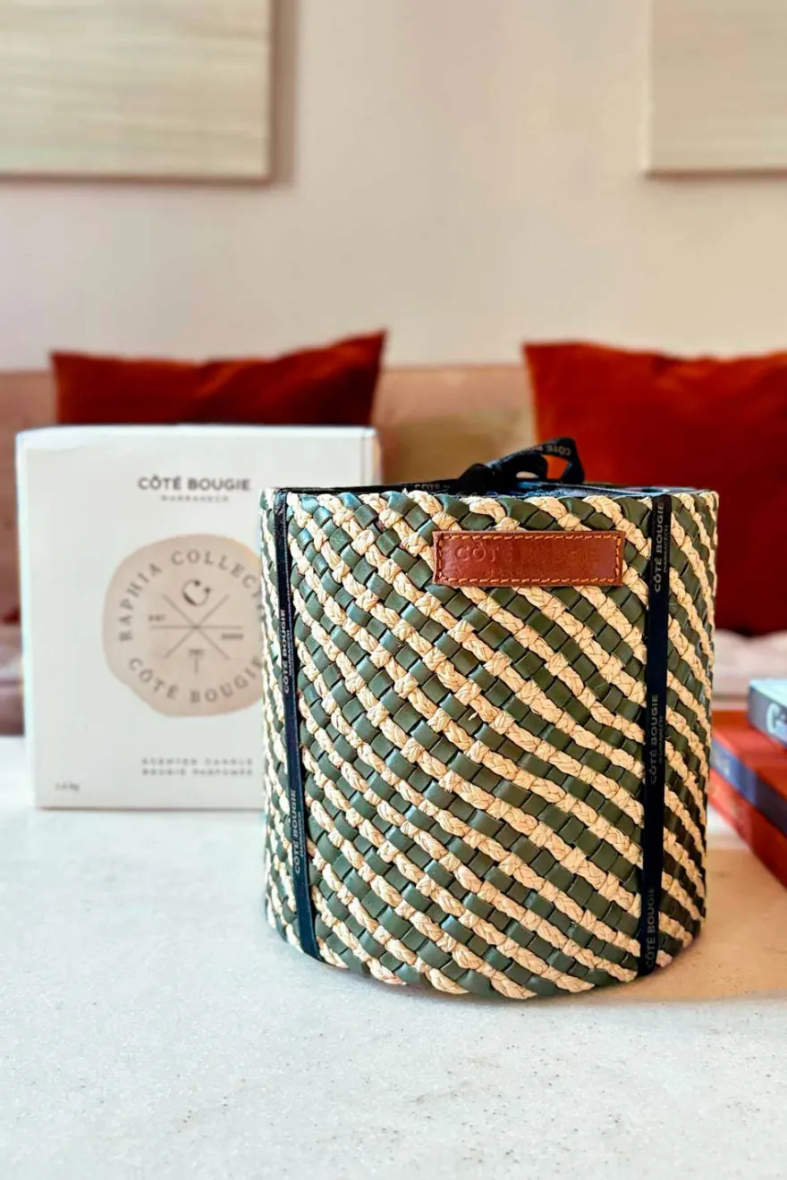 La elegancia artesanal y el saber hacer marroquí se unen en esta vela de cuero y rafia trenzada a mano, ofreciendo un viaje olfativo a través de Marruecos. Cada vela es única y artesanal.