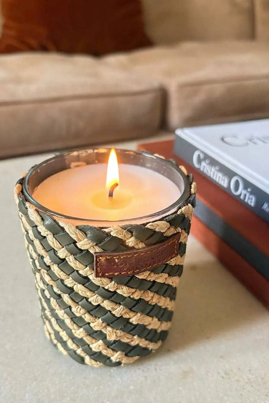 La elegancia artesanal y el saber hacer marroquí se unen en esta vela de cuero y rafia trenzada a mano, ofreciendo un viaje olfativo a través de Marruecos. Cada vela es única y artesanal.