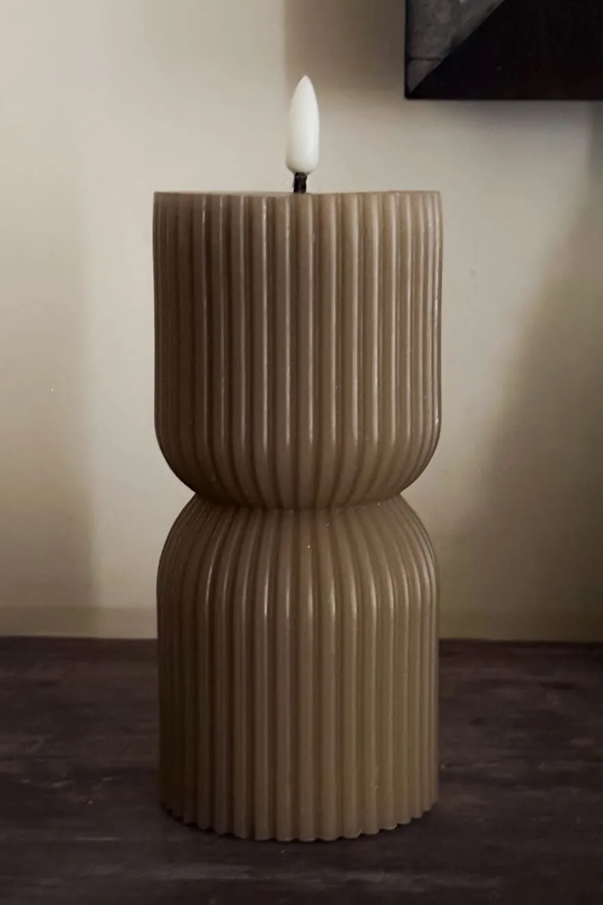 Vela LED de cera con diseño moderno y textura ondulada que aporta un toque elegante y contemporáneo a cualquier espacio. Su color gris y su forma singular la convierten en un elemento decorativo distintivo, ideal para crear ambientes cálidos y acogedores.