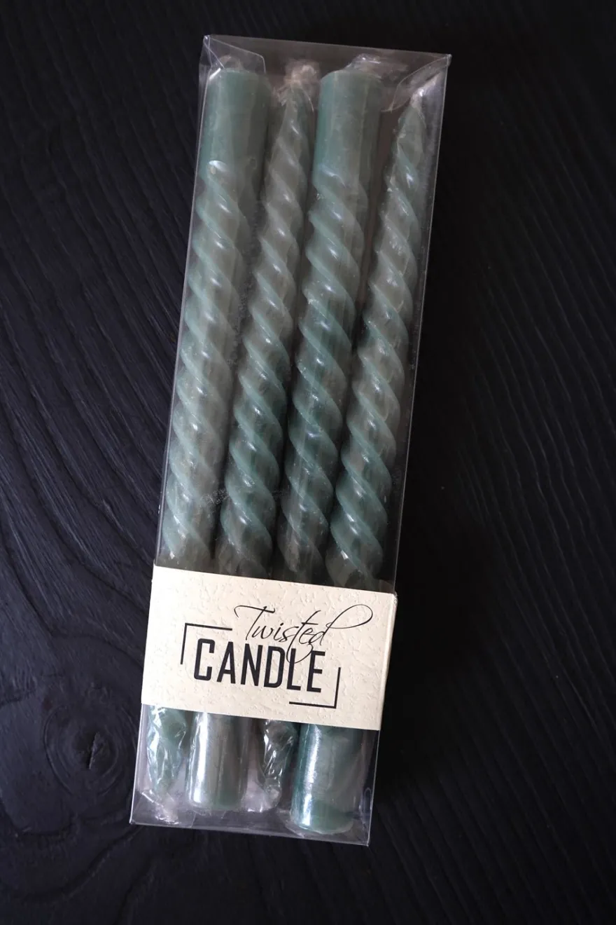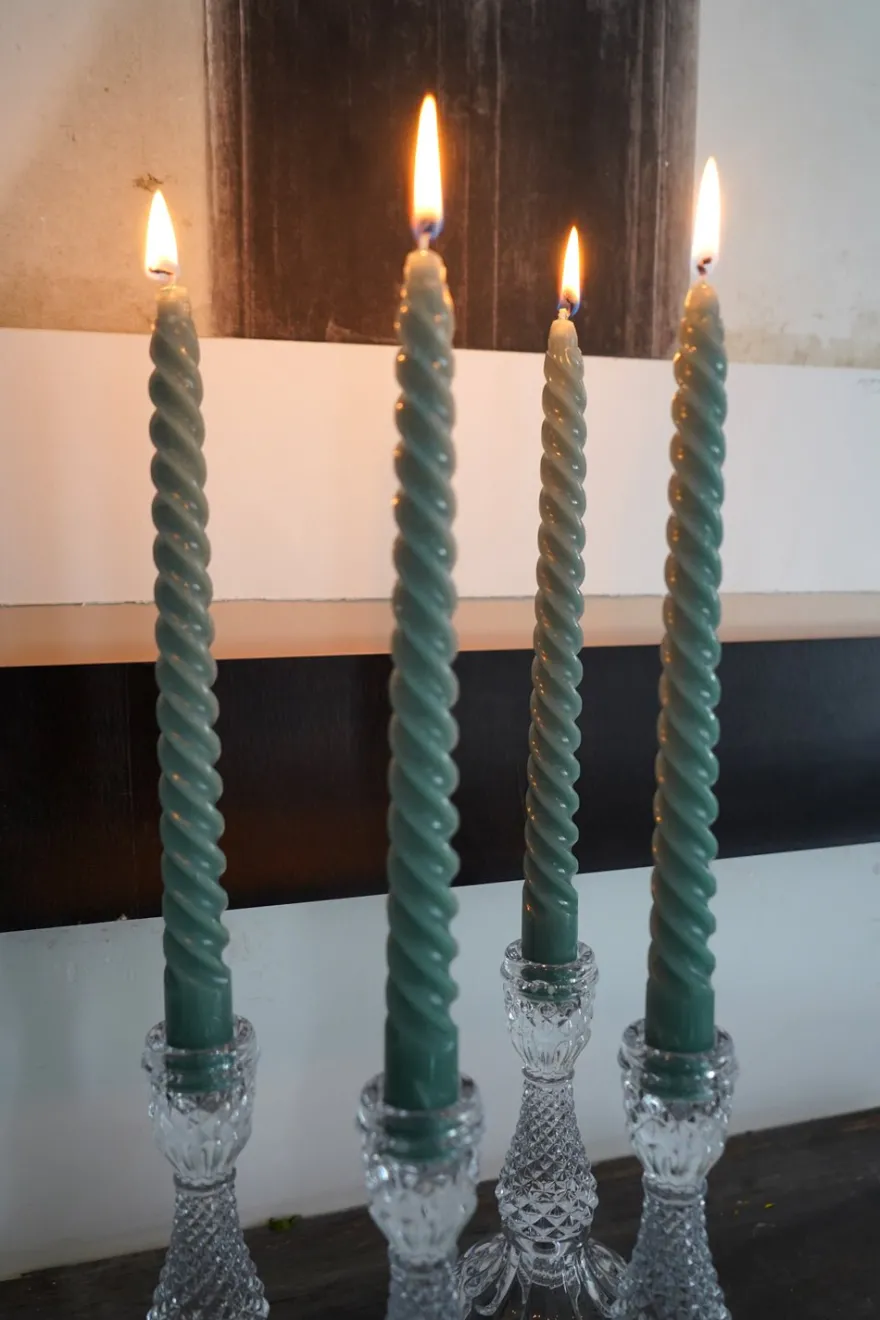 Cuatro velas con diseño en espiral en color verdes, ideales para decorar y ambientar tu casa.