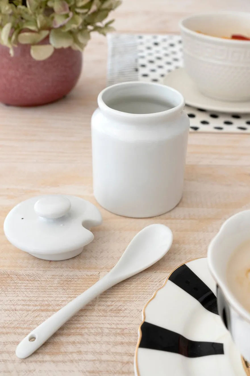 Este azucarero de cerámica blanco con cucharita y tapa, le dará un toque especial a tu mesa.