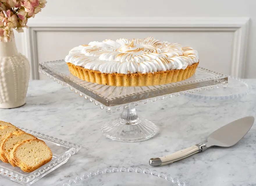 Base cuadrada de cristal perfecta para tartas y postres con diseño de borde de bolitas, versátil para cualquier mesa y época del año.