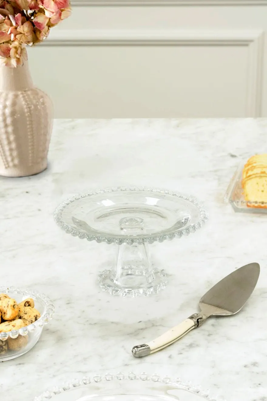 Base redonda de cristal con delicado borde de pequeñas bolitas decorativas, perfecta para realzar la presentación de pasteles, tartas y postres, versátil para cualquier mesa y época del año.