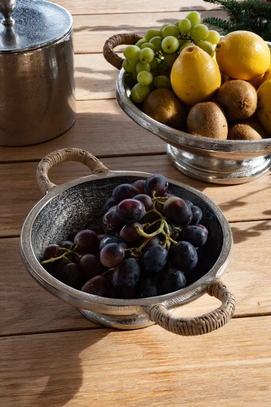 Centro de mesa pequeño de aluminio con asas recubiertas de mimbre, ideal para complementar tus mesas, para usar como centro de mesa o frutero, e incluso para decorar cualquier rincón de tu casa. Su acabado brillante aporta un toque de lujo, mientras que las asas de ratán añaden un detalle rústico.