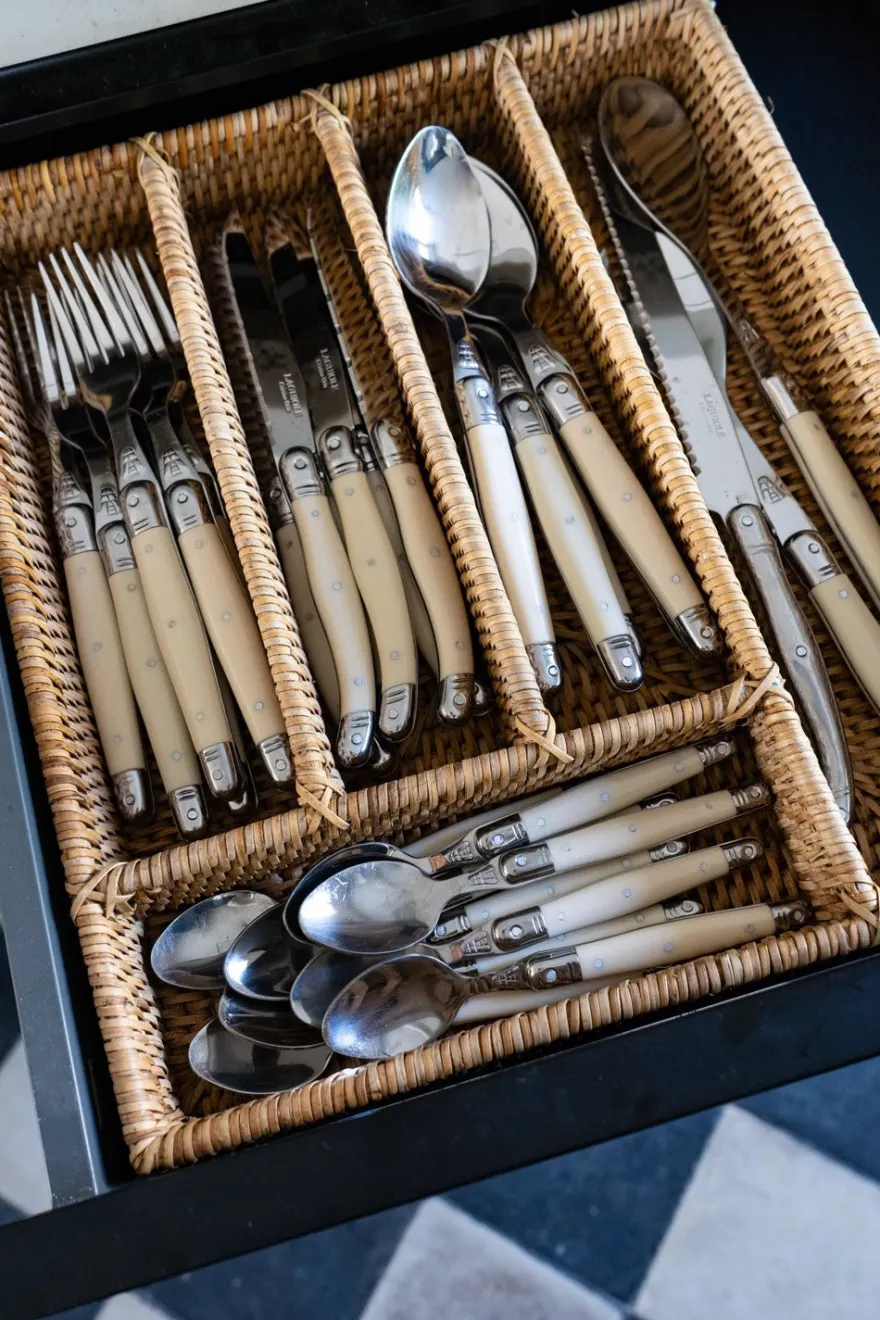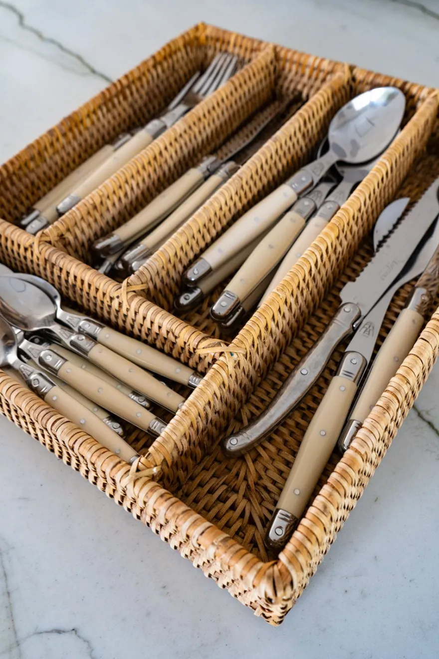 Cubertero rectangular con cinco compartimentos de ratán, ideal para añadir un toque natural y elegante a tu mesa, además de ser una pieza versátil que combina belleza y funcionalidad. Esta colección combina la belleza del material natural con la funcionalidad y el diseño contemporáneo.