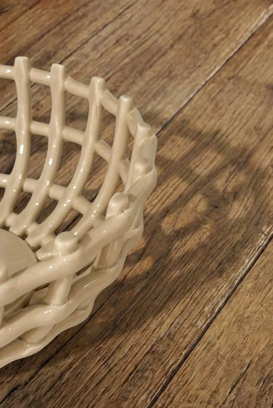 Frutero de porcelana en tono marfil, con un delicado diseño entrelazado que aporta ligereza visual y textura artesanal. Una pieza sencilla y elegante, ideal para aportar calidez natural a la cocina o al comedor.