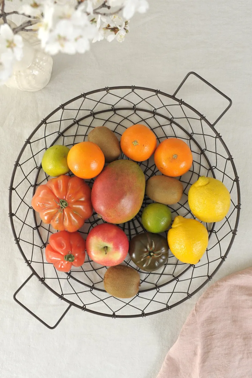 Cesta de alambres en color negro para colocar frutas y verduras.