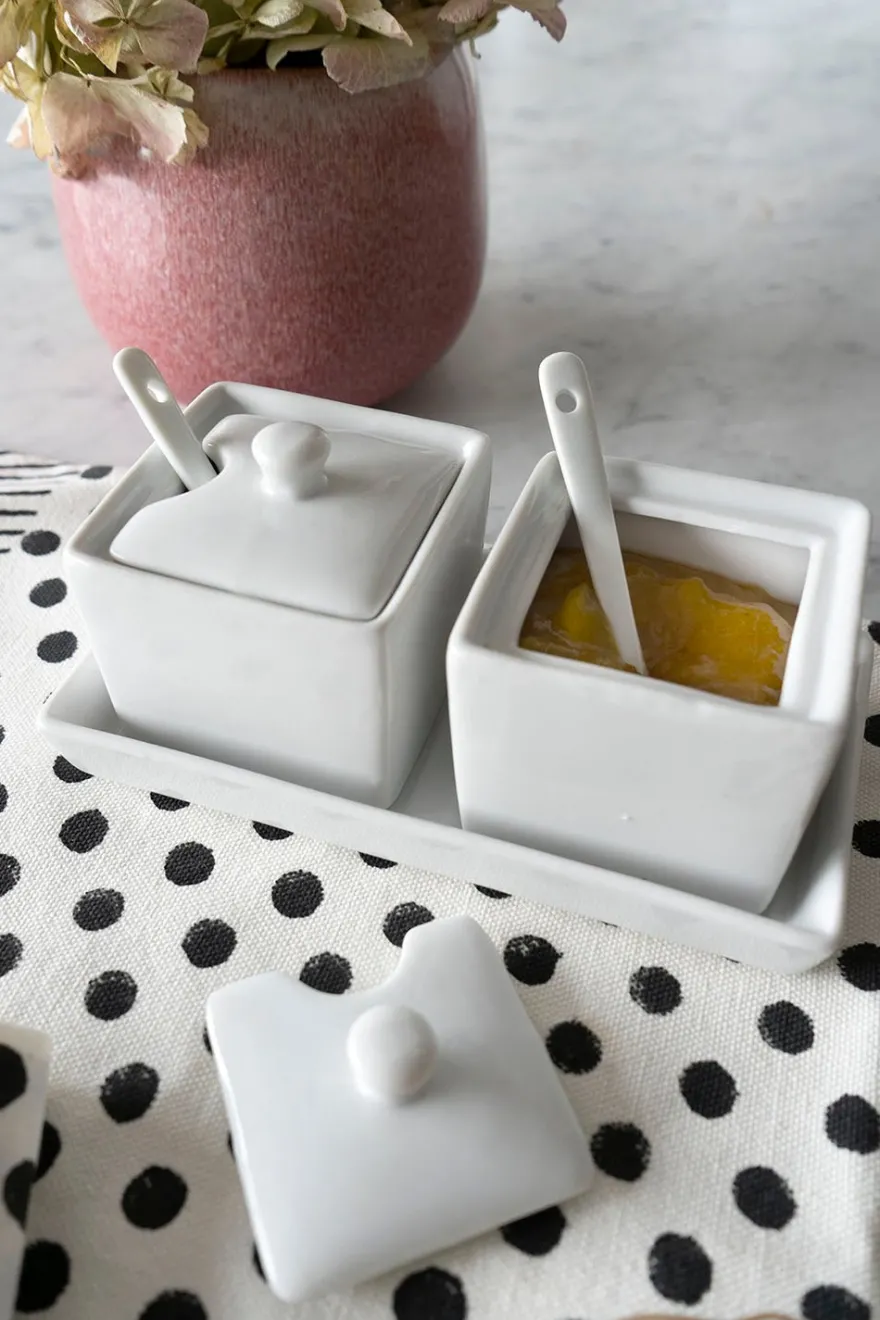 Juego de dos tarritos de cerámica blanca con tapita y cucharita, sobre una bandejita para sostenerlos.