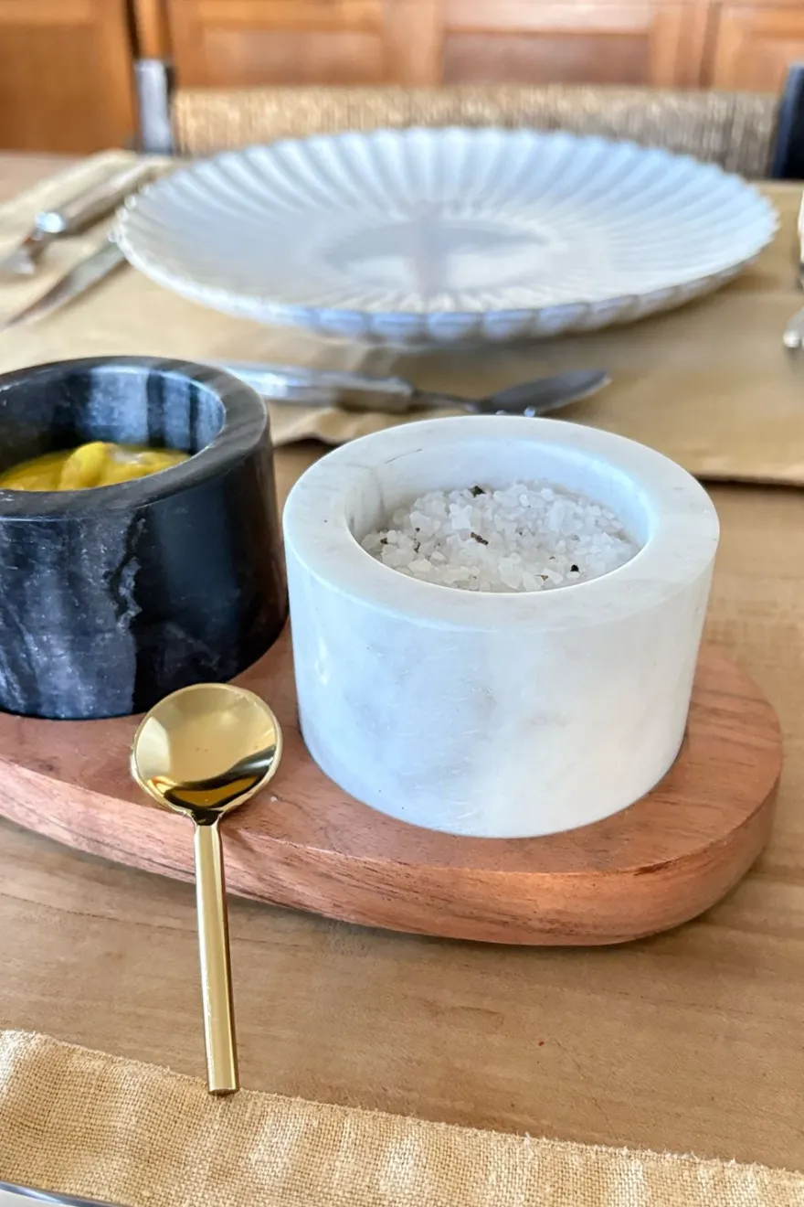 Aporta elegancia y funcionalidad a tu mesa con este exclusivo set de dos recipientes de mármol: uno en tono blanco y otro en negro, pensados para combinar con cualquier estilo de decoración. Incluye una cucharita dorada que añade un toque sofisticado, y una base de madera que unifica el conjunto y protege las superficies.