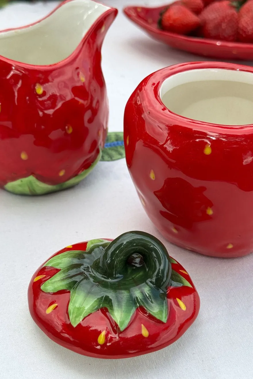 Set de azucarero y lechera de loza fina esmaltada con diseño de fresa,100% artesanal, ideal para complementar y dar un toque fresco, original y diferente a tus mesas.