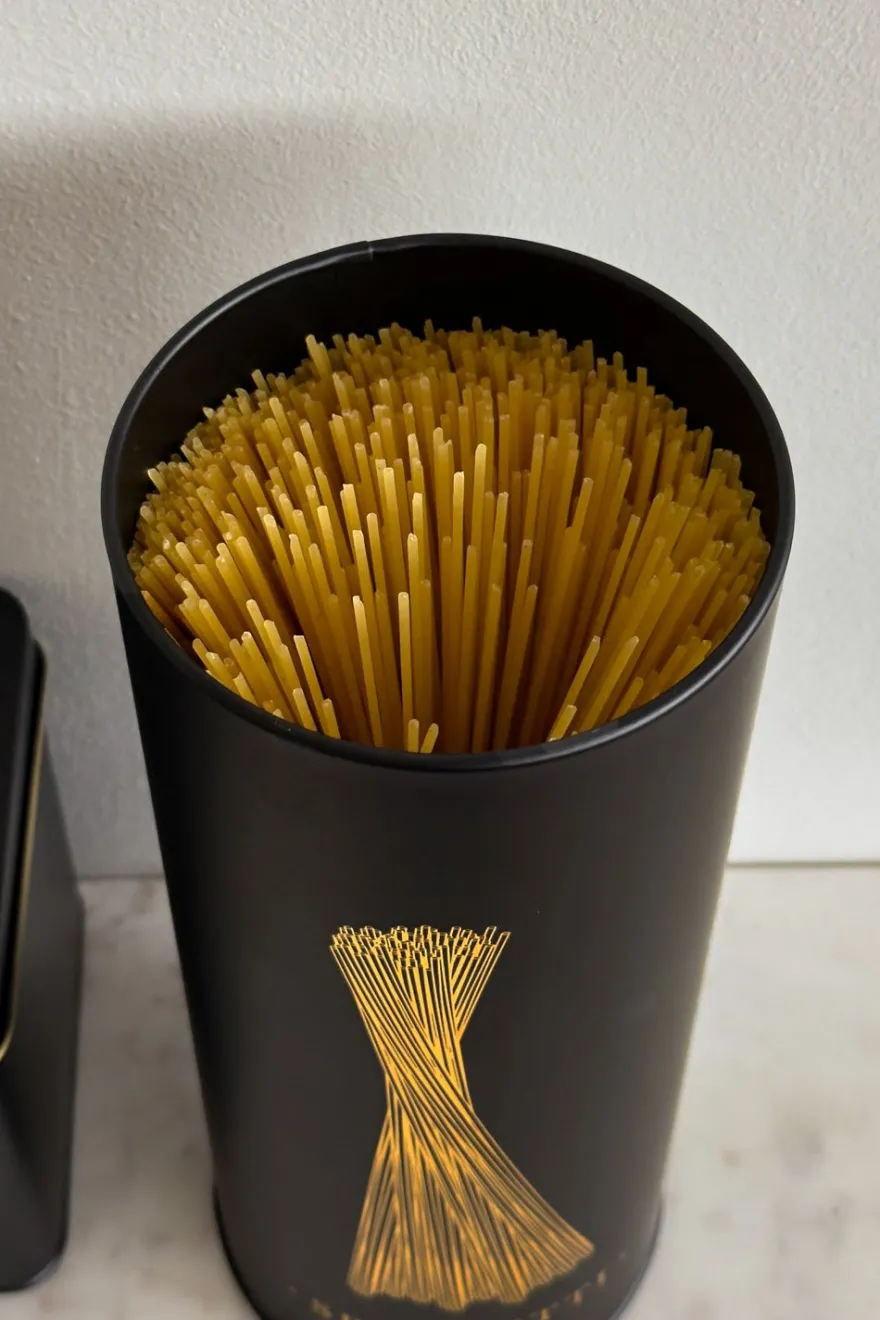 Guarda y conserva la pasta de forma práctica y elegante con este bote metálico en acabado negro mate, diseñado especialmente para almacenar espaguetis y pasta larga.