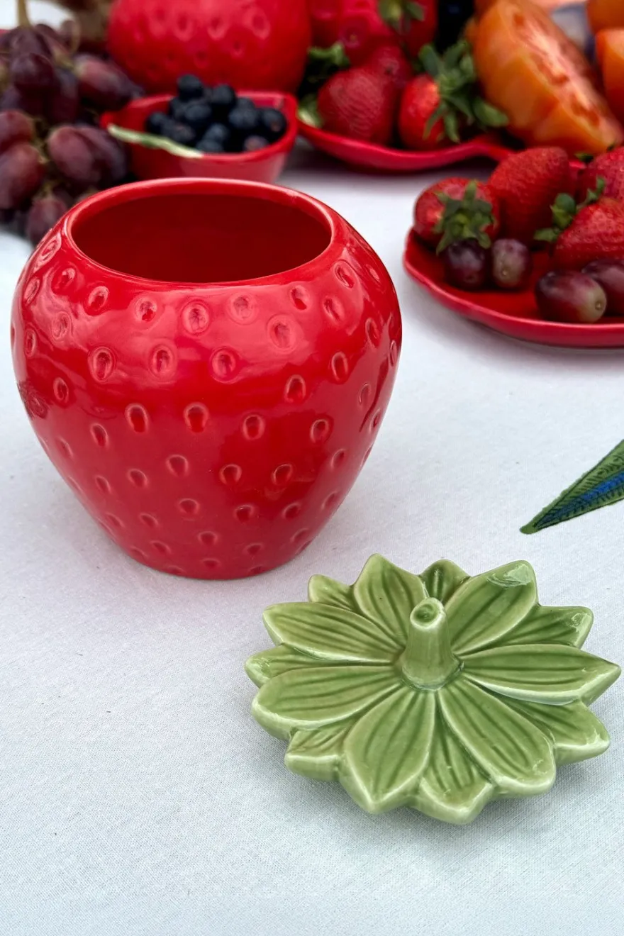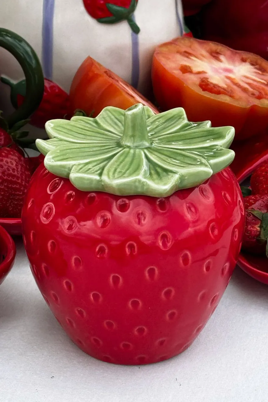 Recipiente con tapa y diseño de fresa,100% artesanal, ideal para complementar y dar un toque fresco, original y diferente a cualquier rincón de casa.