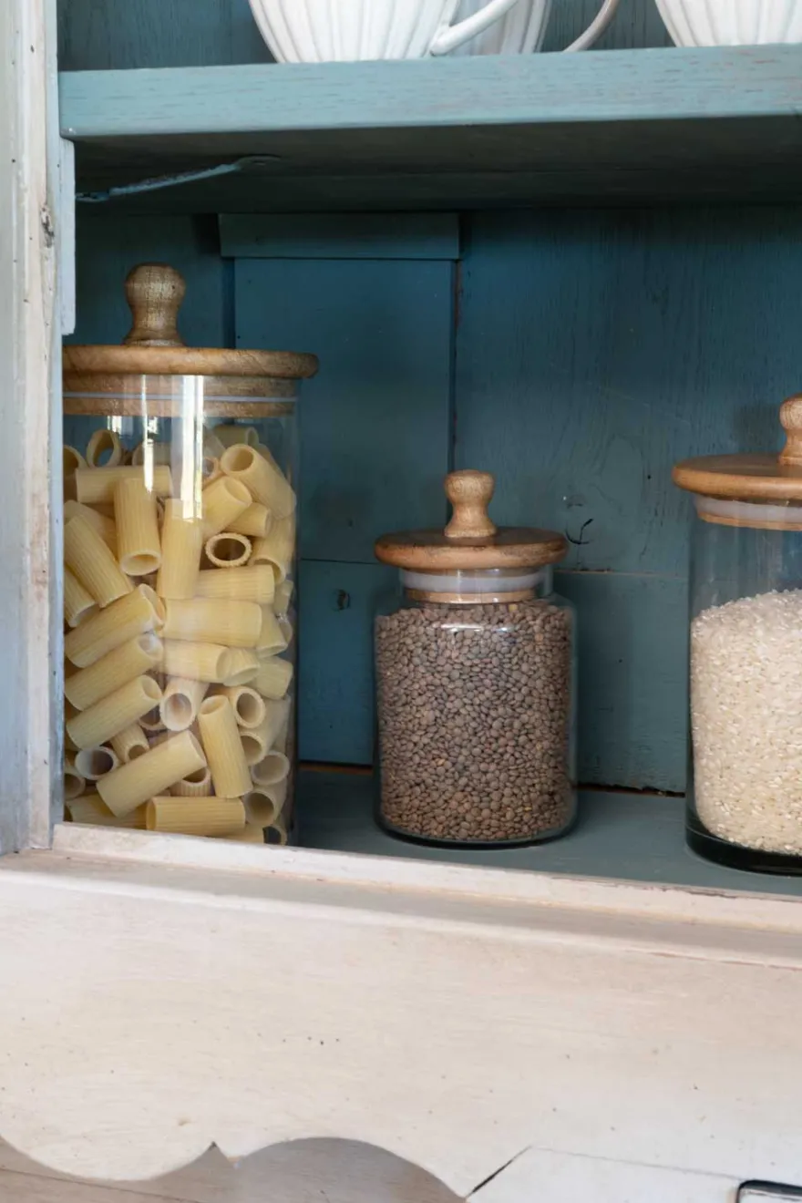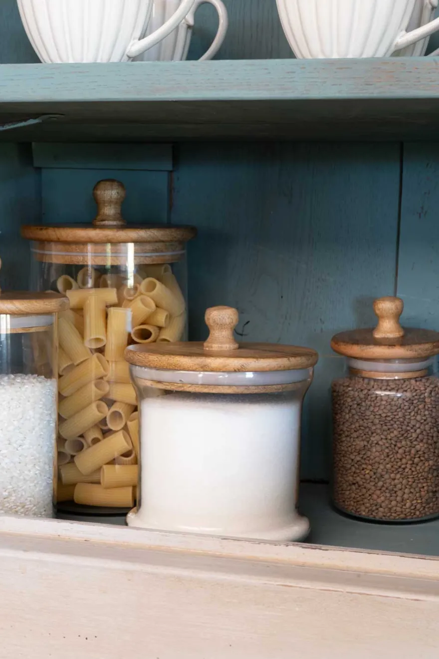 Tarro de cristal con tapa de madera perfecto para almacenar distintos tipos de alimentos como fideos, nueces, harina, especias…