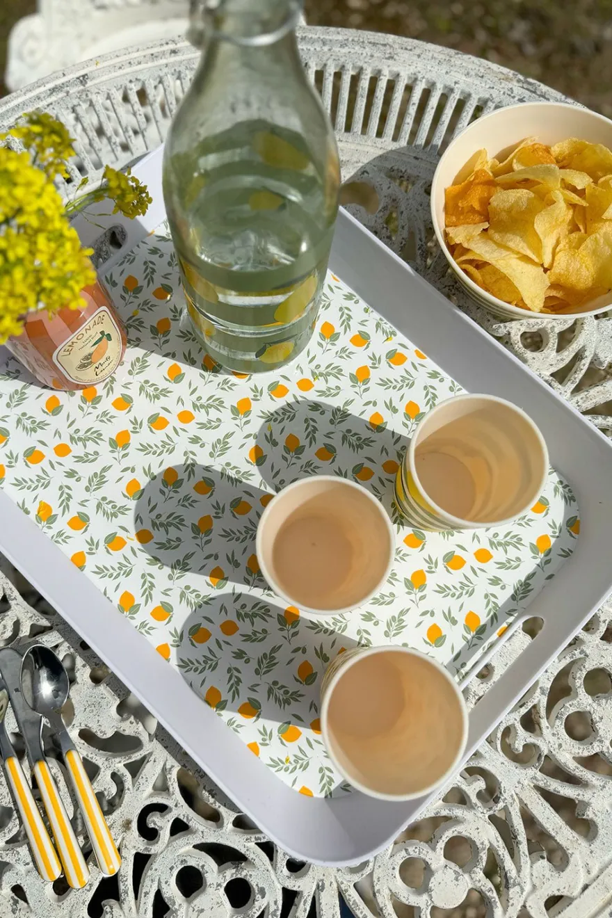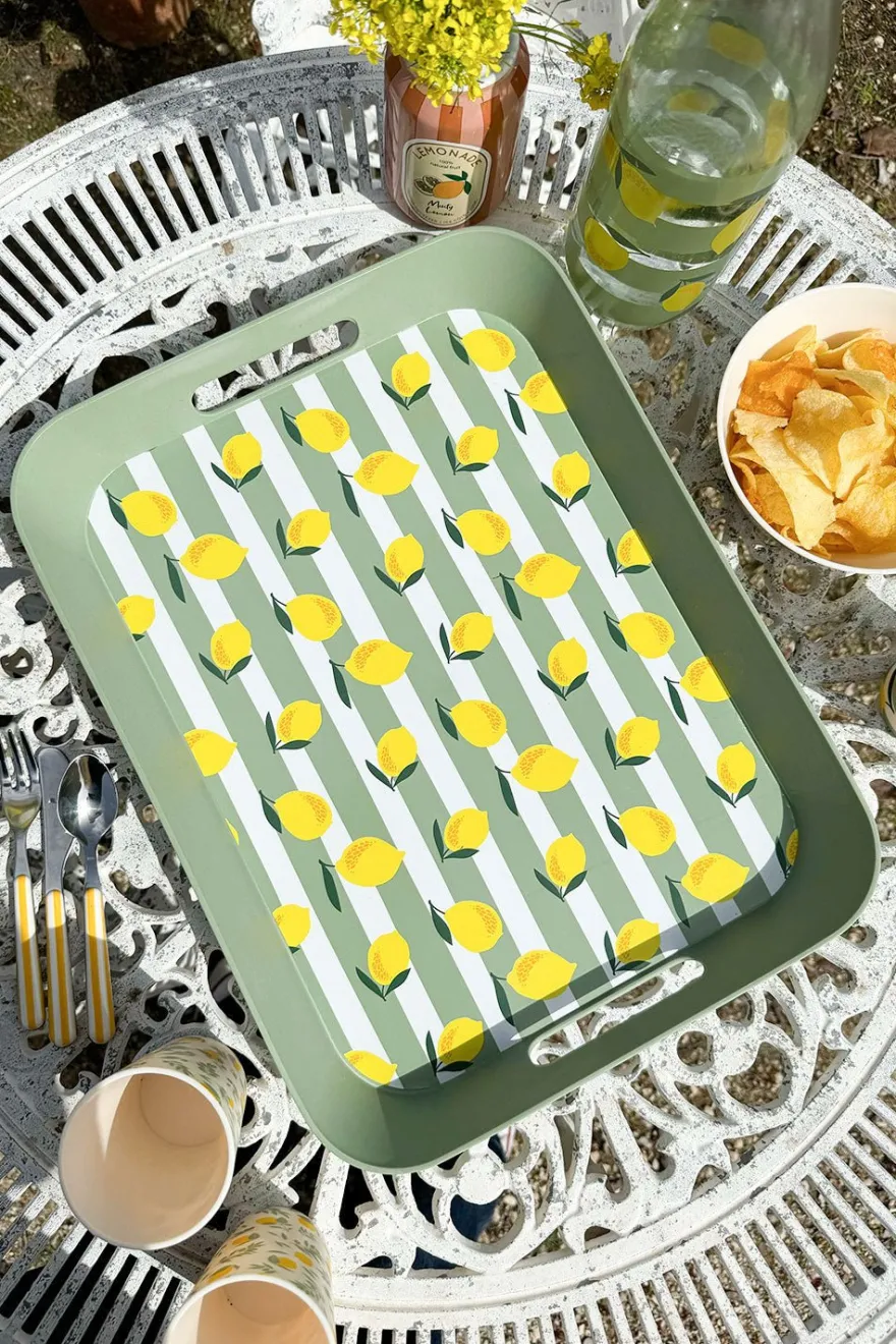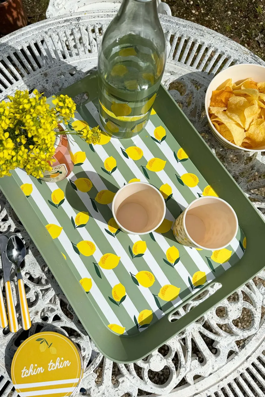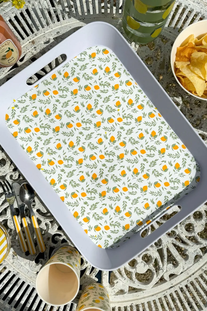 Bandeja con asas de polipropileno con diseño de limones, ideal para complementar y dar un toque fresco, original y diferente a tus mesas en primavera y verano. Además es perfecta para planes de piscina, barco… ya que es muy resistente a los golpes gracias al material del que esta hecha.