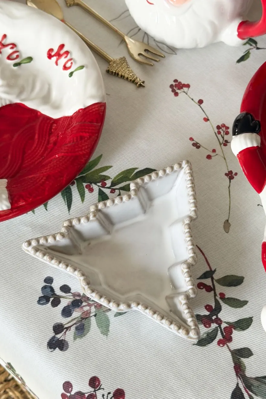 Bandeja de porcelana con forma de abeto y un delicado borde decorado con pequeñas bolitas.